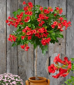 Das Campsis-Stämmchen Fire Trumpet Vine® verwöhnt Sie den ganzen Sommer über mit brillanten, roten Trompetenblüten! Das glänzende, sattgrüne Laub lässt die Blüten der Trompetenblume noch intensiver strahlen. Das Campsis-Stämmchen Fire Trumpet Vine® (Campsis tagliabuana) ist auch als Klettertrompete bekannt & zaubert mit seinen blütenbesetzten, halbhängenden Trieben ein exotisches Ambiente auf Balkon, Terrasse und in den Garten. Mit ihrer Blüh- und Wuchsfreude wird diese Pflanze zum garantierten Blickfang.