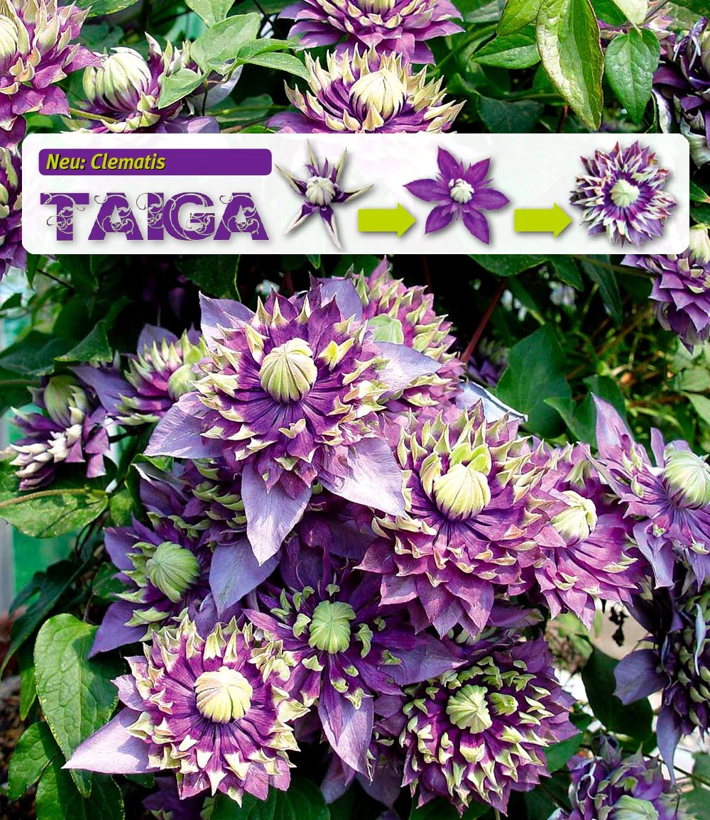 Die brandneue Raritäten-Clematis Taiga® hat besonders raffinierte, auffällig schöne Blüten! Die handtellergroßen Blüten der Pflanze entwickeln sich in 3 Stufen bis hin zur vollgefüllten Blüte. Ein echtes Schauspiel in Ihrem Garten. Über viele Monate im Jahr erscheinen an der Clematis Taiga® neue Blüten und verzieren das grüne Blattlaub. Diese idealen Kletterpflanzen, auch Waldreben genannt, sorgen mit den purpur-violett-grünen Blüten für einen Eyecatcher im Beet & Kübel.