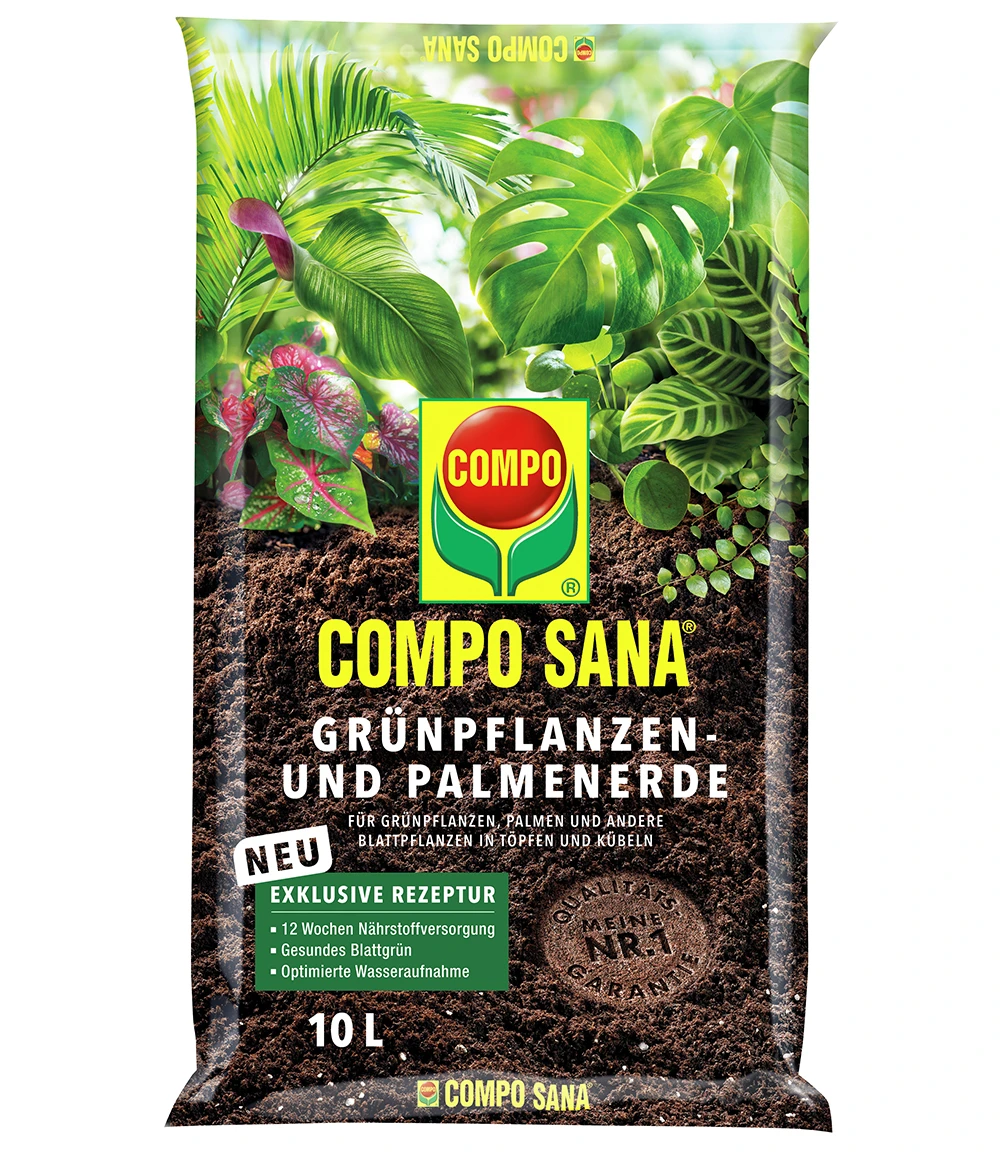 Die COMPO® SANA® Grünpflanzen- und Palmenerde ist eine hochwertige Spezialerde für alle Grünpflanzen, Palmen und Farne. Das auf die Bedürfnisse dieser Pflanzen abgestimmte Dünger-Depot wirkt sofort und gewährleistet eine optimale Nährstoffversorgung für bis zu 8 Wochen. Für eine lockere Struktur und gute Wasseraufnahme des Substrates sorgen PERLITE Atmungsflocken. Der Wurzel-Aktivator AGROSIL® unterstützt die Entwicklung dekorativer Blätter.