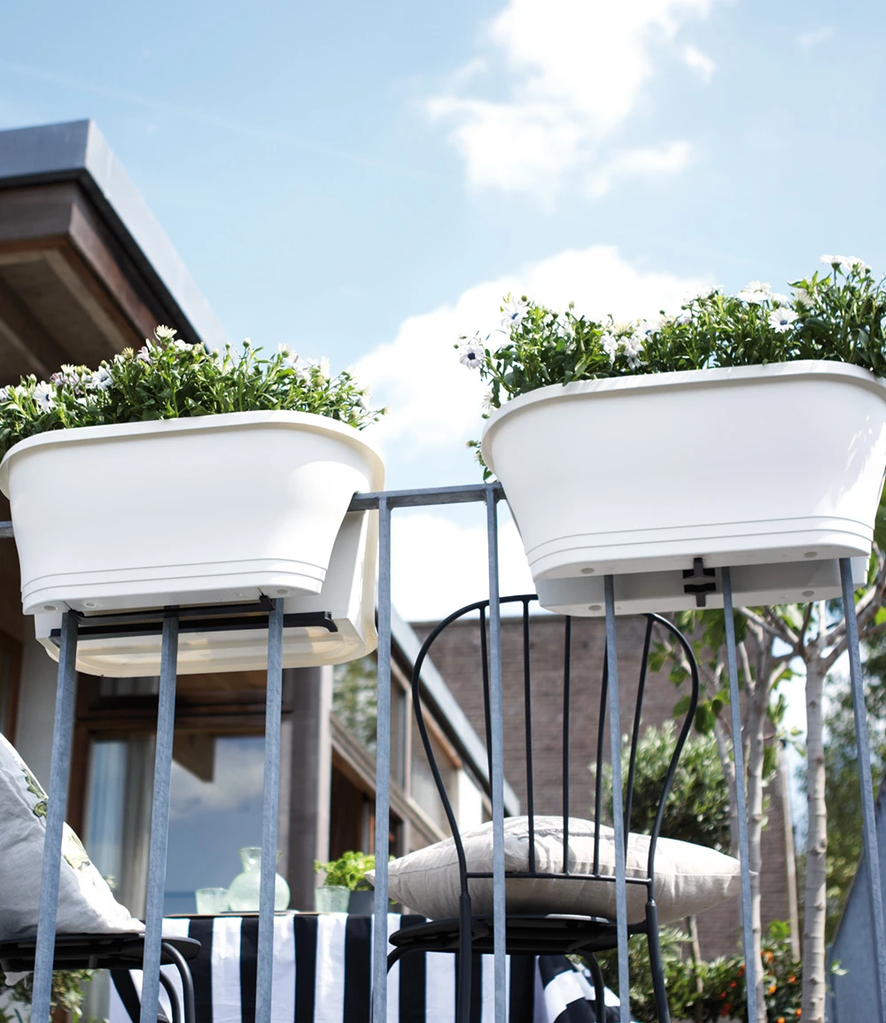 Patentiertes Pflanzgefäß für Balkongeländer von Elho®! Corsica Flower Bridge® weiß sieht extrem dekorativ und modisch aus und lässt sich kinderleicht befestigen! Das Gefäß hat ein Volumen von 18 Litern und bietet so allen Balkon- & Sommerblühern (z. B. Petunien, Geranien, Verbenen etc.) ausreichend Platz. Corsica Flower Bridge® weiß ist eine optimale Alternative zu hängenden Balkonkästen. Durch dieses pfiffige Accessoire können auch Rundgeländer in Szene gesetzt werden. Corsica Flower Bridge ist in verschiedenen Farben erhältlich und daher für kreative Gestaltungen geeignet! Der Kunststoff ist witterungsstabil und somit lange haltbar. Corsica Flower Bridge lässt sich an fast jedem Geländertyp befestigen.