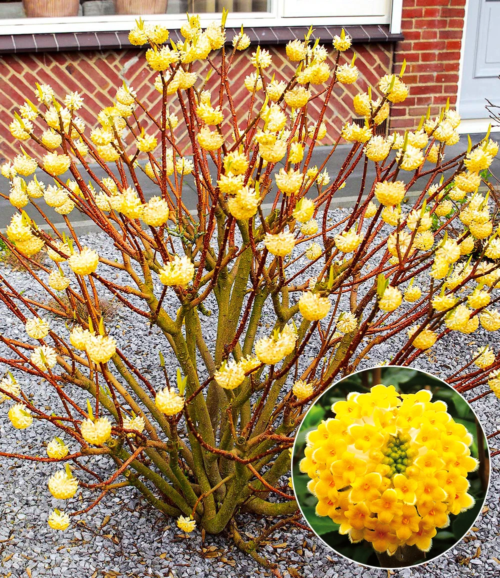 Wenn es im Winter grau und kalt ist, dann hat die japanische Papierpflanze, Edgeworthia Grandiflora, ihren großen Auftritt. Denn sie blüht im Winter mit ihren gelb-weißen, runden Blüten, die den winterharten Zierstrauch dicht an dicht schmücken. Die Rinde wird in Japan zur Herstellung von hochwertigem Papier verwendet. Die Edgeworthia Grandiflora ist sehr beliebt, weil sie eine wunderschön dekorative Pflanze ist und sich für Gärten, Terrassen und Balkone eignet. Noch bevor das dunkelgrüne Laub austreibt, erscheinen zur Blütezeit von Februar bis April duftende Blüten und setzen einen auffälligen Akzent in der blütenarmen Jahreszeit.