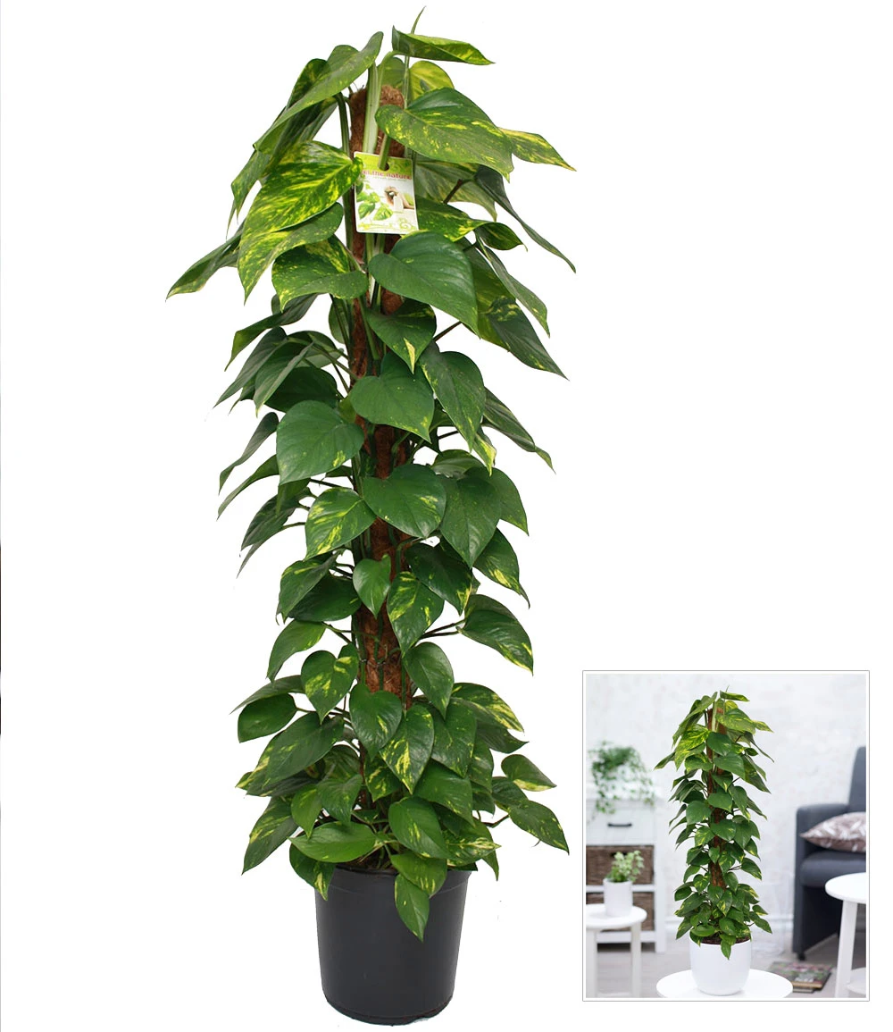 Immergrün, pflegeleicht und unkompliziert! Die Efeutute am Moosstab ca. 120-130 cm hoch ist eine extrem anpassungsfähige Zimmerpflanze. Das aus dem tropischen Asien und dem Pazifikraum stammende Aronstabgewächs (Araceae) ist auch als Epipremnum oder Goldranke bekannt. Mir ihren herzförmigen, marmorierten Blättern verleiht sie jedem Büro und jedem Wohnraum eine frische Ausstrahlung. Zudem unterstützen diese tropischen Zimmerpflanzen mit ihren hervorragenden luftreinigenden Eigenschaften auch das Raumklima. Die fantastische Kletterpflanze Efeutute am Moosstab bildet seidenweiche Blätter an bis zu 10 Meter langen Ranken aus und schlingt sich gekonnt mit diesen Trieben um ihren Moosstab.