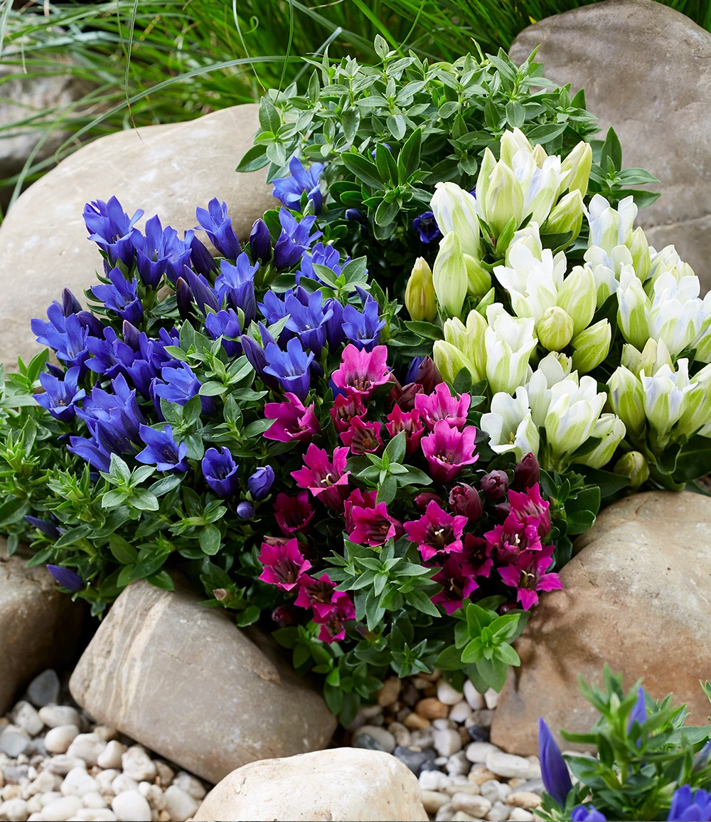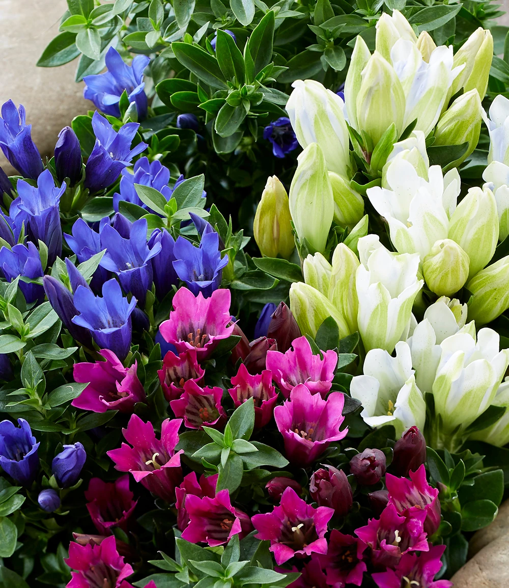 Der Enzian-Mix liebt einen sonnigen bis halbschattigen Standort und wird 20 bis 30 cm hoch. Die pflegeleichten, mehrjährigen Stauden gedeihen am besten in einem humusreichen, feuchten, aber durchlässigen Boden. (Gentiana)