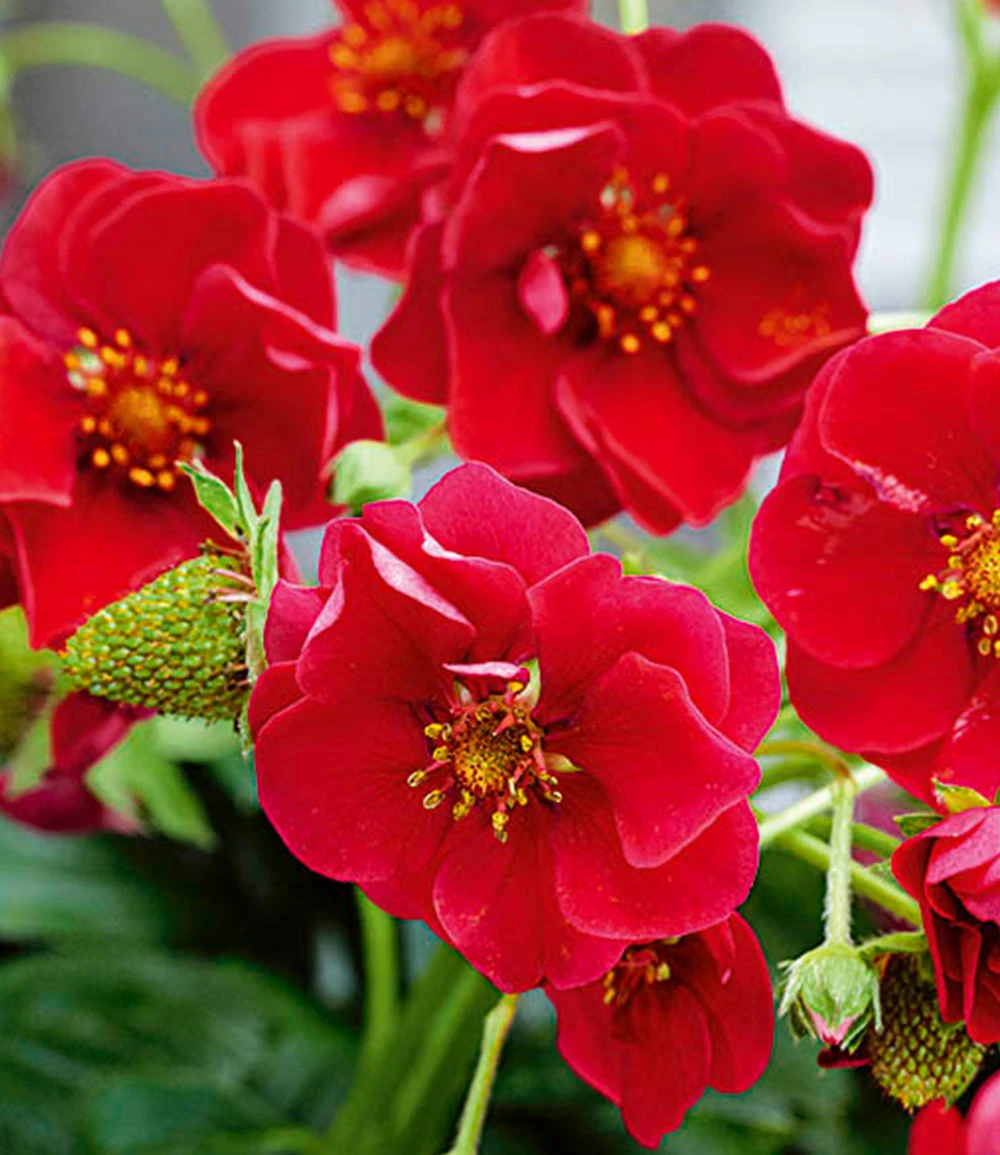 Mit ihren wunderschönen, roten, gefüllten Blüten, die über dem gesunden, dunkelgrünen Laub thronen, fällt die immertragende Erdbeere Summer Breeze Rose sofort ins Auge! Die kompakten Pflanzen bilden nur wenige Ausläufer und sind dadurch perfekt für Töpfe & Kästen auf Balkon und Terrasse geeignet! Dort können Sie den ganzen Sommer über den herrlichen Anblick genießen und aromatische, süße Erdbeeren ernten. Die immertragende Erdbeere Summer Breeze Rose (Fragaria x ananassa) garantiert eine lang anhaltende Farbenpracht, da die Pflanze viele Büschel aus gefüllten Blüten bildet, die ihre Blütenblätter nicht verlieren. Die rosarote Blütenfarbe und die roten Früchte ergeben einen leuchtenden Farbkontrast.