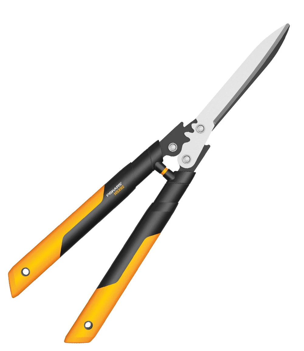 Fiskars® PowerGear Getriebe-Heckenschere: Durch den Getriebemechanismus wird die Schneidleistung erhöht, denn dieser setzt dann ein, wenn mehr Kraft beim Schneiden benötigt wird. Somit kann man bei gleichbleibendem Krafteinsatz mehr Leistung erzielen und lange ermüdungsfrei Schneiden. Klingen aus rostfreiem Stahl, antihaftbeschichtete obere Klinge zur Reibungsreduzierung, Griffe aus speziellem Kunststoff. Gelenkschonende Puffer. Die Fiskars® PowerGear Getriebe-Heckenschere ermöglicht effizientes Arbeiten auch mit den Scherenspitzen. (Fiskars® Artikel-Nr. 114770)