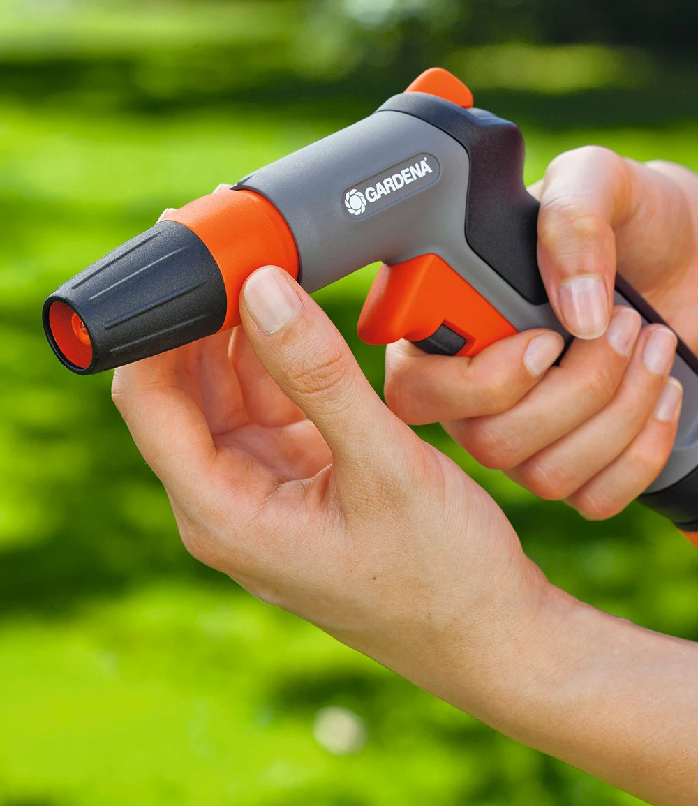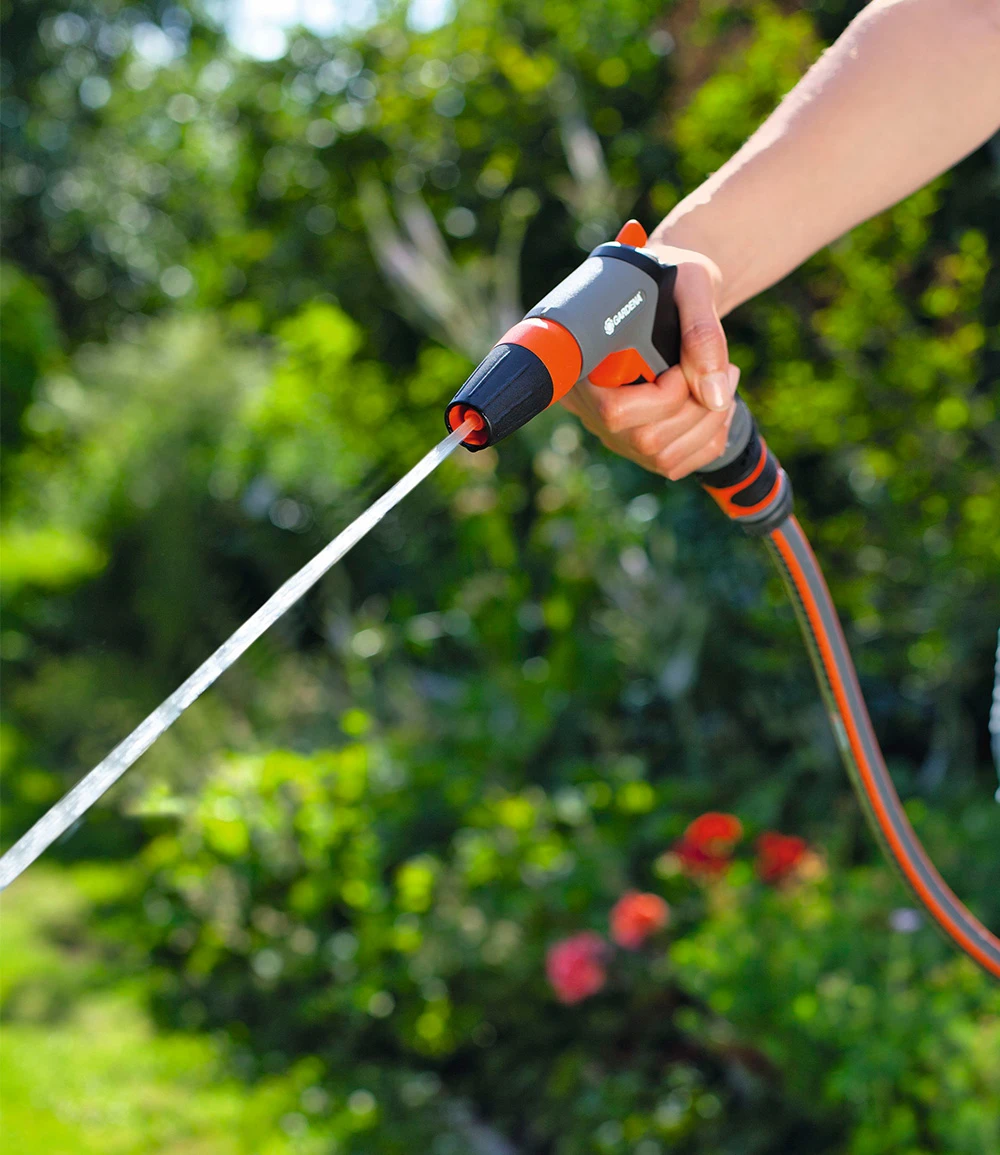 Die GARDENA® Classic Reinigungsspritze bietet alle Funktionen, die Sie für Reinigungs- und Bewässerungsarbeiten im Garten benötigen. Dank der stufenlosen Wassermengenregulierung können Sie selbst entscheiden, welcher Durchfluss für Ihren Zweck ideal ist. Weichkunststoffring am Kopf zum Schutz vor Beschädigung. Der Vollstrahl eignet sich zu Reinigungszwecken, der feine Sprühnebel ist ideal zum Besprühen empfindlicher Pflanzen. Für einen konstanten Wasserdurchfluss kann der Impulsauslöser arretiert werden. Auf diese Weise wird die Übermüdung der Hand verhindert. (Gardena®-Artikel-Nr.: 18301-20)