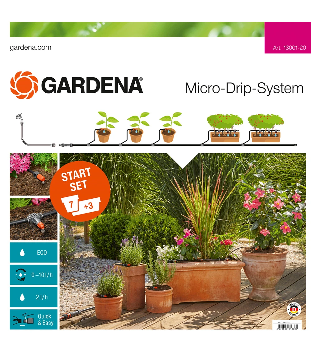 Es beinhaltet 1 Basisgerät 1000, 15 m Verlegerohr, 10 m Verteilerrohr, 7 regulierbare Endtropfer 0 – 10 l/h, 9 Reihentropfer 2 l/h, 10 Reduzier-T-Stücke, 1 Verschlusskappe 13 mm (1/2″), 3 Verschlusskappen 4,6 mm (3/16″), 10 Rohrhalter 13 mm (1/2″), 15 Rohrhalter 4,6 mm (3/16″) und 1 Reinigungsmodul. Das Start-Set ist erweiterbar. (GARDENA® Art-Nr. 13001-20)