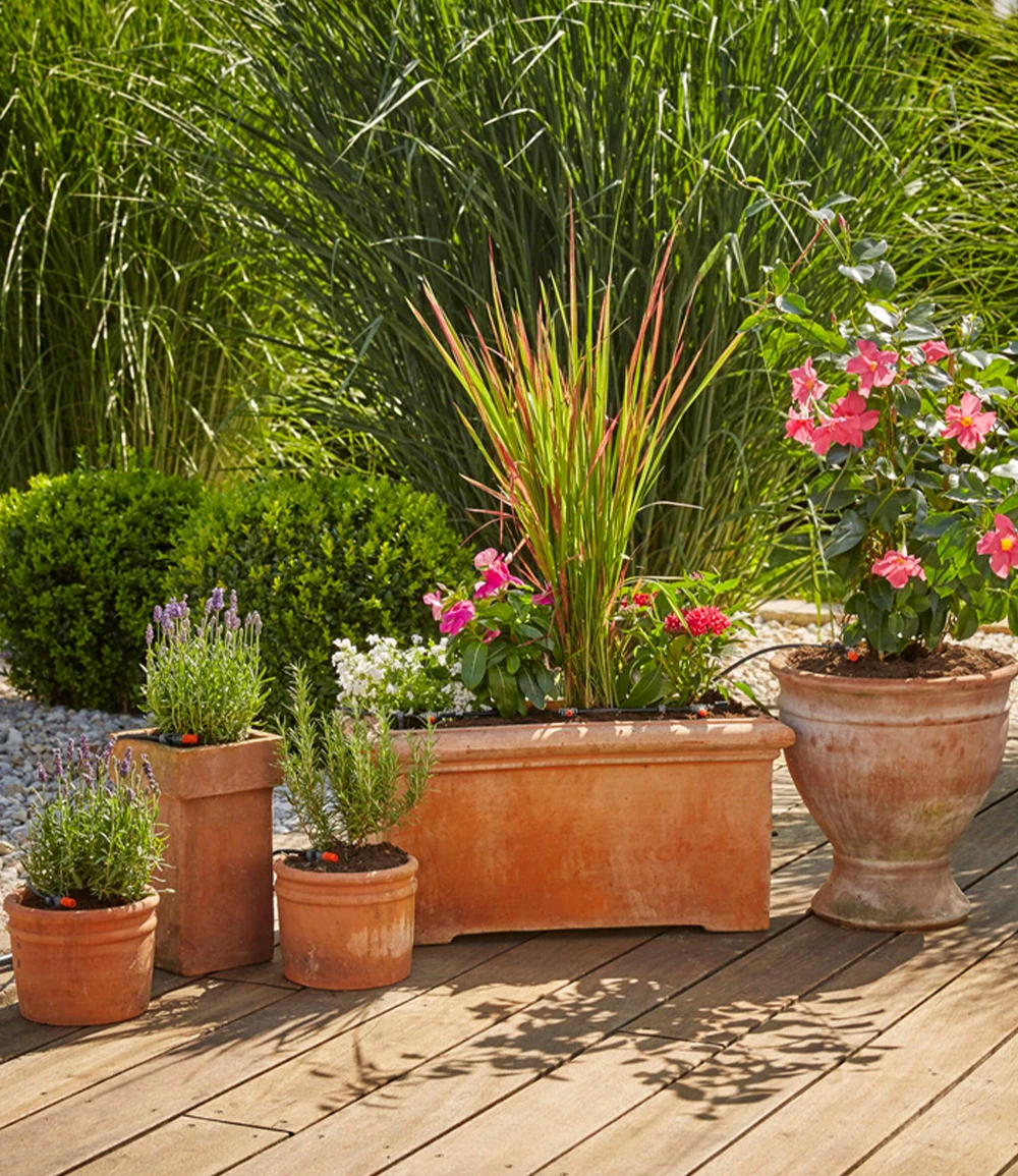 Mit dem GARDENA® Micro-Drip-System Start-Set Pflanztöpfe M können Sie 7 Pflanztöpfe und 3 Pflanztröge versorgen.
