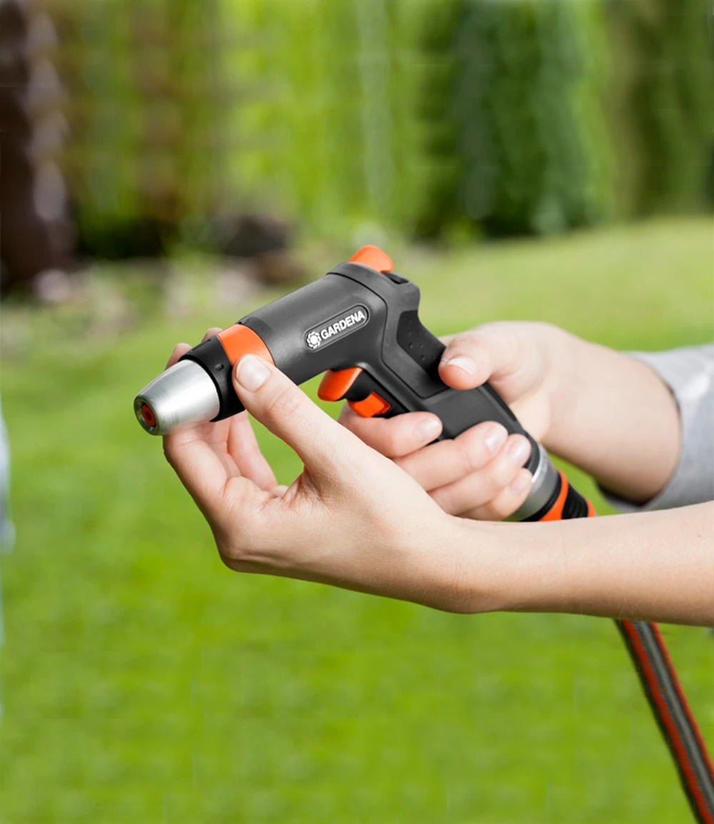 GARDENA® Premium Metall-Spritze ist aufgrund des Metallanteils sehr stabil. Die stabile Metall-/Kunststoff-Ausführung mit optimierter Gewichtsverteilung und Weichkunststoff-Elementen ermöglicht eine angenehme Handhabung. Der Wasserstrahl ist stufenlos regulierbar vom Vollstrahl bis zum feinen Sprühnebel. Darüber hinaus ist eine stufenlose Dosierung der Wasserabgabe möglich. Die GARDENA® Premium Metall-Spritze verfügt zusätzlich über einen Impulsauslöser mit Dauerarretierung. (GARDENA® Art.-Nr.: 18305-20)