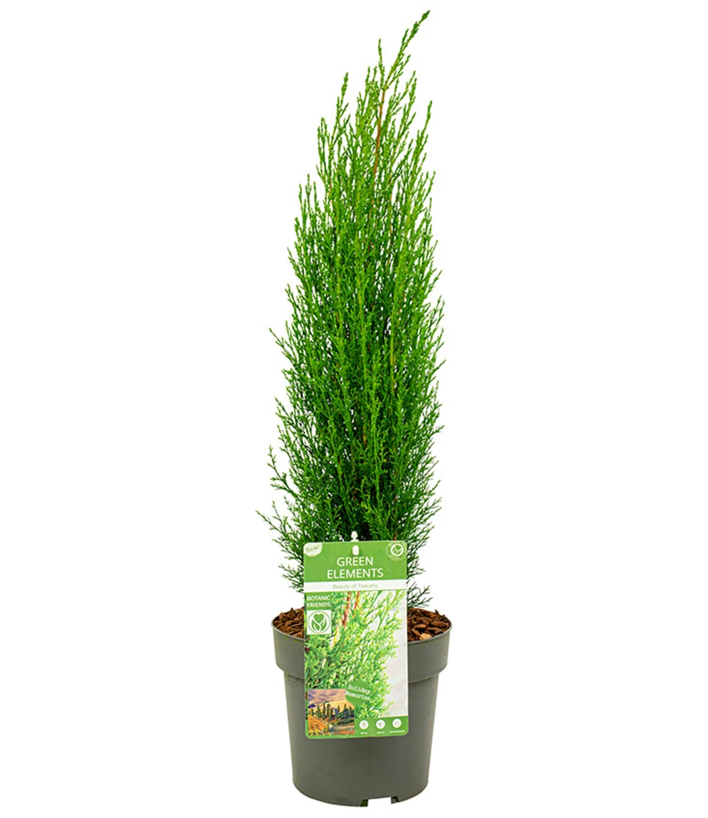 Green Elements® ‚Beauty of Tuscany‘ bevorzugt einen sonnigen bis halbschattigen Standort. Die winterharten, mehrjährigen Säulenzypressen werden ca. 50 cm breit. Die schlanken Zypressen bzw. Mittelmeerzypressen wachsen kerzengerade ohne jeden Schnitt in die Höhe und sind frostsicher bis –25 °C. (Cupressus sempervirens)