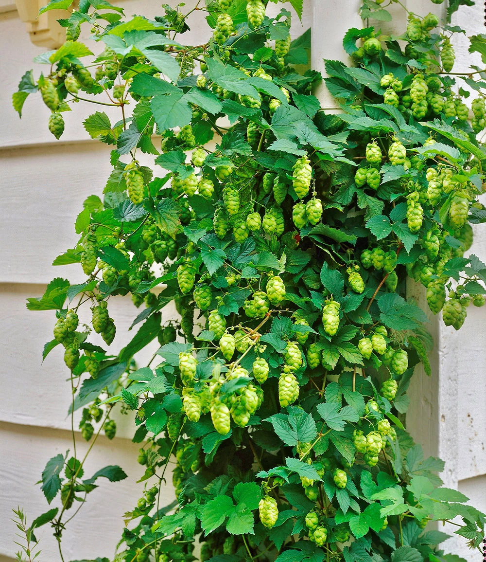 Die Kletterpflanze Hopfen im 1,5-Liter Containertopf ist mit ihrem Fruchtbehang ein ausgesprochen effektvoller Blickfang an Fassaden, Mauern, Pergolen & Zäunen. Im Sommer trägt sie unendlich viele hellgrüne, tannenzapfenähnliche Hopfenfrüchte, deren guter Duft allgemein sehr geschätzt wird. Hopfen im 1,5-Liter Containertopf (Humulus lupulus) klettert schnell auf eine Wuchshöhe von bis zu 3,5 Metern. Der optimale Standort für Hopfen im 1,5-Liter Containertopf ist in der Sonne & im Halbschatten. Die mehrjährige, winterharte Kletterpflanze zieht sich im Winter wie eine Staude in den Boden zurück und treibt im Frühjahr wieder neu aus. Der Pflegeaufwand & Wasserbedarf ist gering bis mittel. (Humulus lupulus)