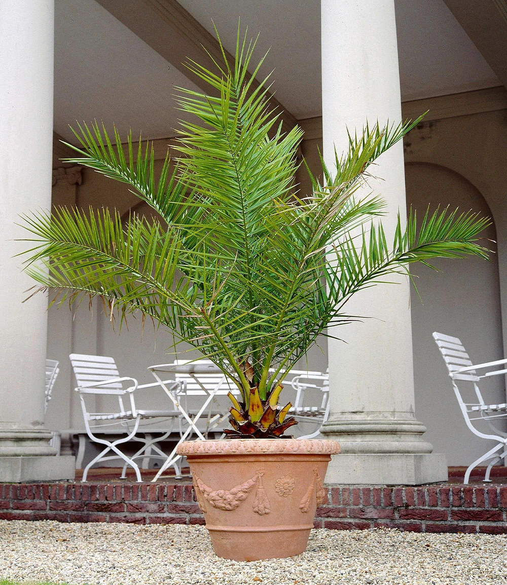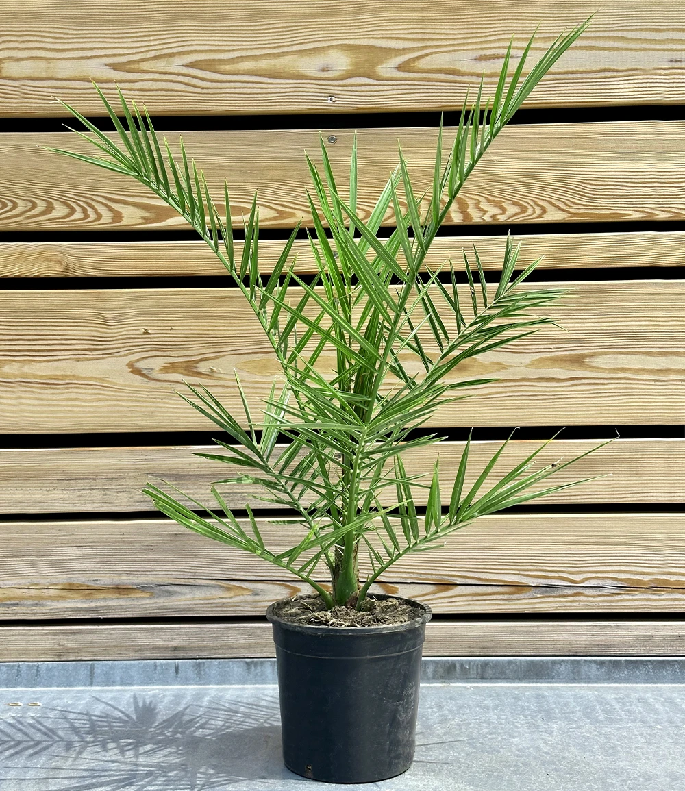 Die kanarische Dattelpalme ist eine imposante, immergrüne Fiederpalme, die als Kübelpflanze sehr beliebt ist! Die attraktive Palme bildet laufend neue, frischgrüne Blattwedel, die am Ende des Stammes eine eindrucksvolle Krone bilden. Die Phoenixpalme, wie die kanarische Dattelpalme (Phoenix canariensis) auch genannt wird, sorgt für ein mediterranes Ambiente: Im Sommer auf Balkon, Terrasse, im Garten und vor dem Hauseingang und im Winter in der Wohnung. Diese Palmen sind frostbeständig bis ca. – 6° C.