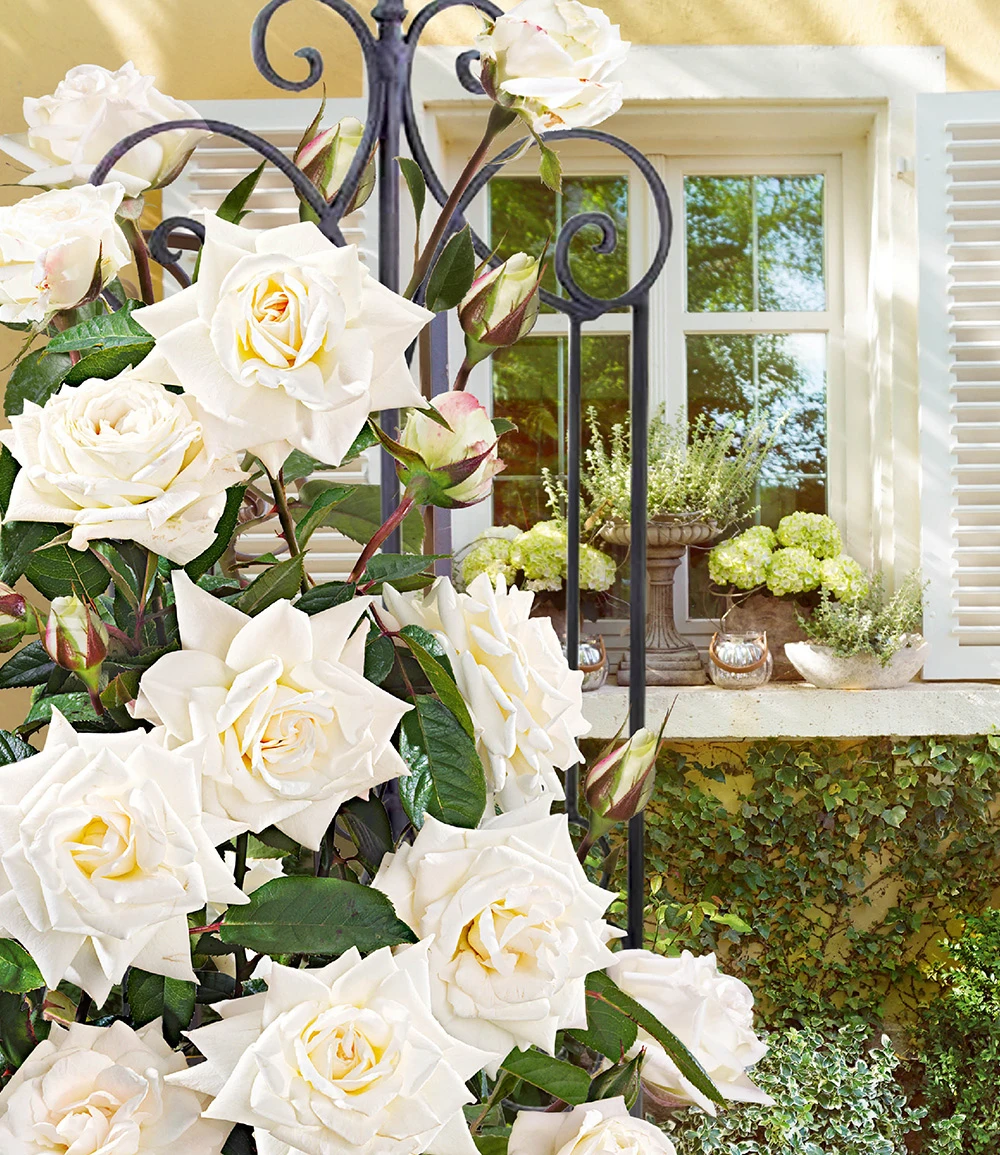 Grandios erstrahlen die edlen Blüten im Sonnenlicht. Das satte Grün der Blätter lässt die weißen Blüten der Kletter-Rose ‚Blanche Colombe®‘ intensiv leuchten. Sie ist sehr kletterfreudig und gesund. Georges delbard Kletter-Rosen zeichnen sich durch einen atemberaubenden Wuchs und einen unvergleichlichen Duft aus. Diese aromatische Blütenpracht ist einzigartig in der Welt der Kletterrosen. Mehrmals im Jahr erscheinen kräftige Knospen, aus denen gesunde Blüten gedeihen. Die Kletter-Rose ‚Blanche Colombe®‘ ist ein Geschenk für jeden Rosenfreund, die durch ihre Pracht und Schönheit besticht.