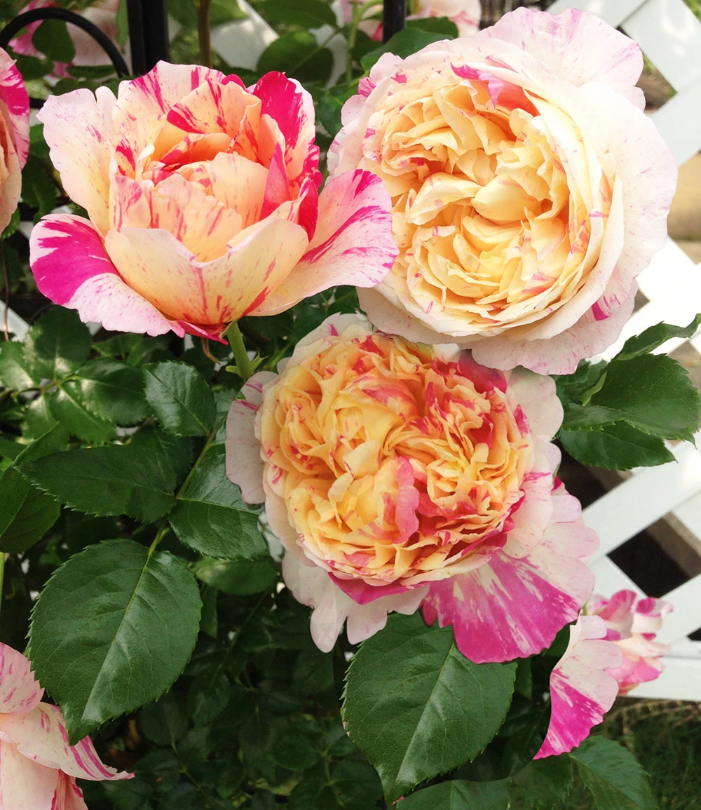Die Kletter-Rose Julie Andrieu® ist eine prachtvolle Rose mit gelber Mitte, umrandet von cremefarbenen Blütenblättern mit rosa Streifen. Das auserlesene Farbspiel der Blüten kommt über den dunkelgrünen, glänzenden Blättern noch wirkungsvoller zur Geltung. Jeder Trieb trägt 2 bis 5 große Blüten, die je 70 bis 80 Blütenblätter vorzuweisen haben. Die Kletter-Rose Julie Andrieu® (Rosa) wird sie mit ihrem intensiven, süßen Duft nach Rose, Himbeere, Kirsche und Walddüften verzaubern. Mit spielerischer Leichtigkeit erklimmt diese Kletterrose jede Rankhilfe und wird mit den großen Blüten zum Blickfang im Garten oder auf der Terrasse. Sie ist pflegeleicht, kräftig und gesund. Diese einzigartige Neuheit in der Welt der Kletterrosen gehört zu den schönsten Rosen ihrer Gattung.