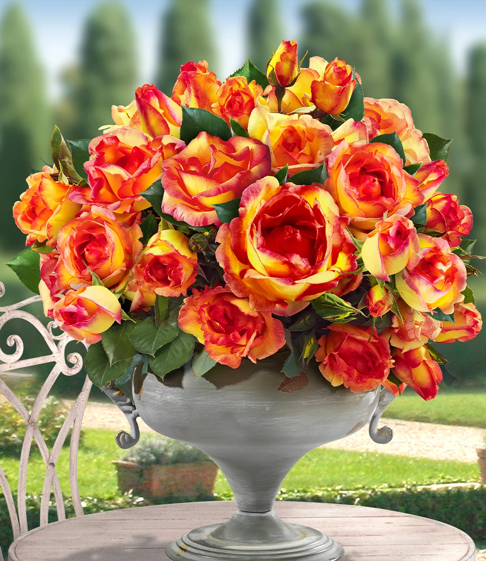 Die Kletter-Rose ‚Parure d’or®‘ ist mit ihrer unglaublichen Farbenpracht einmalig! Die erwachenden Blüten der Rosen begeistern jeden Rosenliebhaber. Das Goldgelb wird umflammt von Karminrot am Rand der Blütenblätter. Die großen, duftenden Blüten der Kletterrosen stürmen an kräftigen Trieben nach oben. Sie erklimmen bereitwillig jede Rankhilfe & Rosenbögen. Von Anfang Juni bis Ende Oktober zeigen sich die zitronig duftenden Blüten. Die Kletterrose ‚Parure d’or®‘ liebt die Sonne und kann ganze Hauswände füllen.