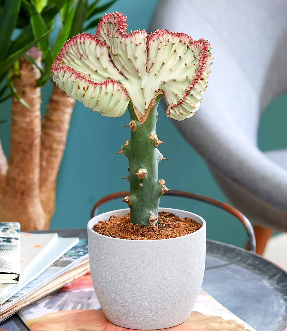 Die Korallenwolfsmilch Cristata ist mit ihrem skurrilen Aussehen ein garantierter Blickfang auf der Fensterbank! Der außergewöhnliche, gewellte Fächer sitzt auf einem kurzen Stamm – das sorgt für die extravagante und korallenähnliche Optik. In der Wohnung und auf dem Schreibtisch im Büro setzt die Korallen-Wolfsmilch, die auch als Korallenkaktus bekannt ist, dekorative und farblich auffällige Akzente. Trotz ihres exotischen Aussehens ist die Korallenwolfsmilch Cristata (Euphorbia lactea Cristata) eine unkomplizierte und pflegeleichte Zimmerpflanze. Als sukkulente Pflanze kann sie in ihren Pflanzenteilen Wasser speichern und muss daher nur selten gegossen werden. Diese Pflanze gibt es verschiedenfarbig, Baldur-Garten kann sie nach der jeweiligen Verfügbarkeit verschicken.