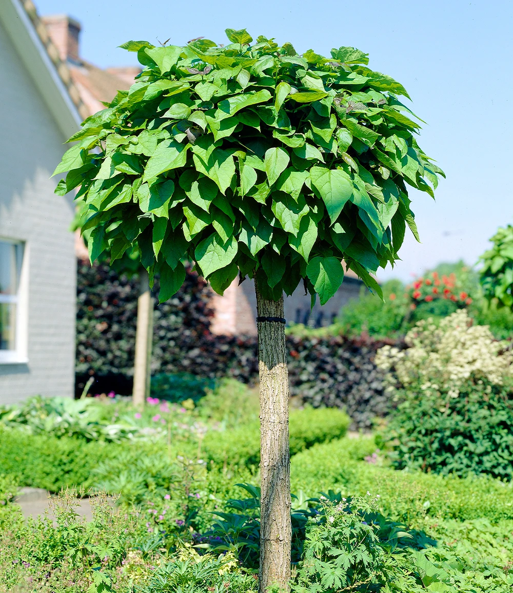 Der Kugel-Trompetenbaum auf Stamm ist ein attraktiver Baum mit angenehm duftendem Laub. Der Duft hält sogar Insekten fern. Zum Schutz der großen Blätter ist ein windgeschützter Platz in der Sonne oder im Halbschatten empfehlenswert. An den Boden stellt das mehrjährige, winterharte Ziergehölz keine besonderen Ansprüche. Für junge Bäume ist ein Winterschutz ratsam, ältere Exemplare sind gut winterhart. (Catalpa bignonioides)