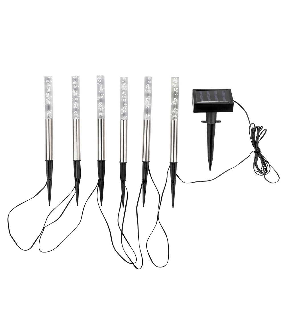 Das schicke LED-Solar Lampenset kann bis zu 6 Stunden, abhängig von Licht- und Wetterverhältnissen, leuchten. Die Lampen werden mit dem Erdspieß einfach in den Boden gesteckt. Durch die eingeschlossenen Luftblasen sind die Lampen auch unbeleuchtet ein Hingucker. Maße: Durchmesser 1,7 cm x 28,5 cm Höhe.