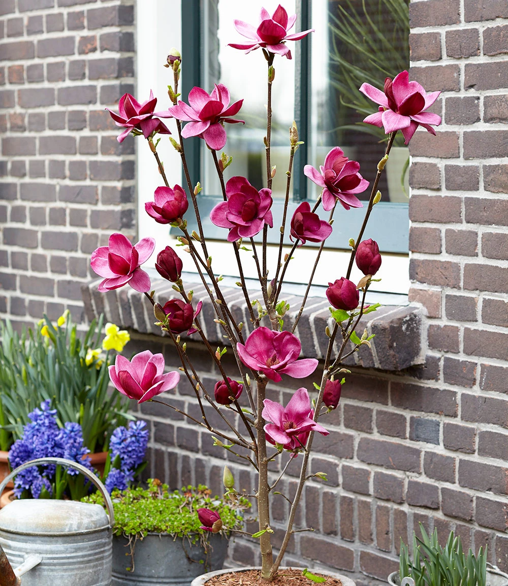 Der beeindruckende Blütenflor im Frühjahr macht die Magnolie ‚Genie®‘ zu einem echten Juwel! Im Sommer folgt eine Zweitblüte! Bereits als 2-jährige Pflanze blüht diese Meisterzüchtung mit vielen opulenten, dunkelpurpurfarbenen Blütenpokalen und macht ihrem Namen alle Ehre! Magnolie ‚Genie®‘ ist extrem winterhart. Im ausgewachsenen Zustand erreicht sie eine Höhe von 4-5 Meter und eignet sich somit auch für einen kleinen Garten!