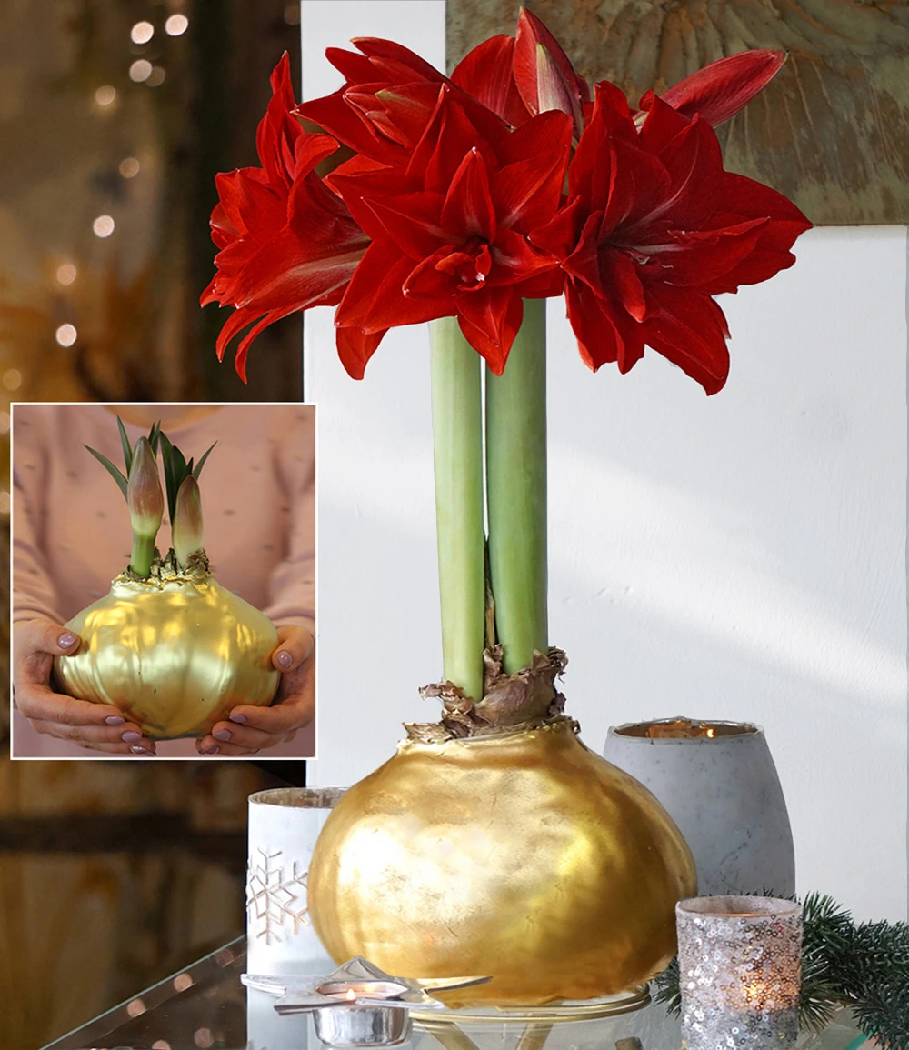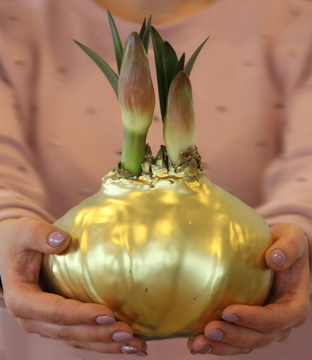 Die extra-große MEGA-Zwiebel (unglaublicher Zwiebelumfang: 40 cm+ !) steht auf einem Edelstahl-Fuß und kann nach Belieben aufgestellt werden. Die MEGA XXL Wachs-Amaryllis Gold wächst und blüht in kurzer Zeit, ohne dass Sie etwas dafür tun müssen. Sie benötigt kein Wasser und auch keine Erde, denn alle Nährstoffe, welche die Amaryllis benötigt, stecken in der Zwiebel. Mit der MEGA XXL Wachs-Amaryllis Gold können Sie ausgefallene Advents- und Weihnachtsdekorationen gestalten. Auch als edle Geschenkidee eignet sich die Wachs-Amaryllis mit ihrer glänzenden, goldenen Umhüllung aus Wachs ganz hervorragend. Die MEGA XXL Wachs-Amaryllis Gold kann im Haus innerhalb von 4 bis 6 Wochen zum Blühen gebracht werden. Dann erfreuen Sie die großen, leuchtend roten Prachtblüten viele Tage lang.
