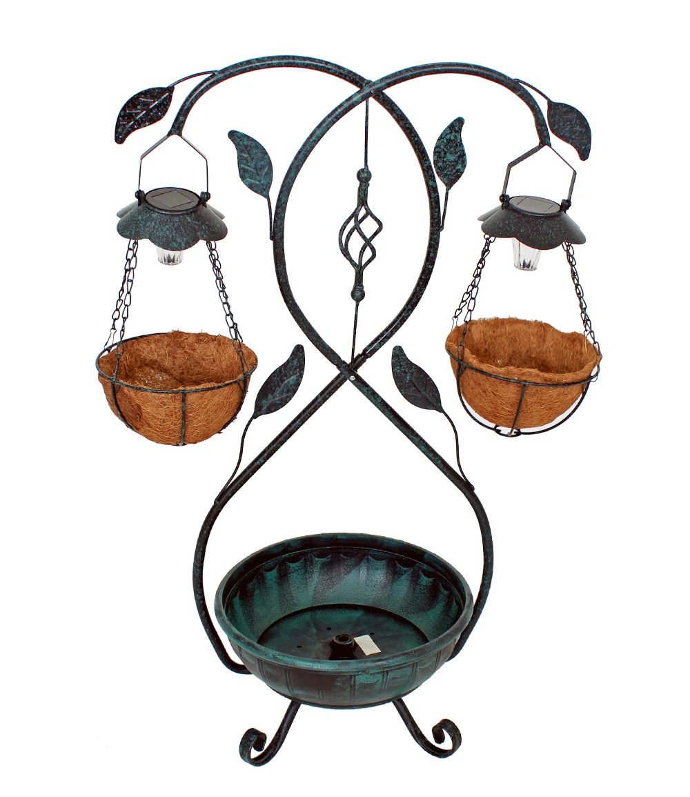 Der Pflanzenständer mit Solarleuchten verfügt über 2 hängende Pflanzkörbe mit Kokosmatten und eine große Pflanzschale aus Kunststoff unten. Damit bietet er Ihnen zahlreiche Möglichkeiten, Ihre Blumen und Pflanzen dekorativ zu arrangieren. Die 2 Laternen mit Solarleuchten funktionieren ohne lästige Verkabelung, nur mit Solar-Energie, sie laden sich bei Tag auf und geben bei Einbruch der Dämmerung ein sanftes Licht ab. Der Pflanzenständer mit Solarleuchten ist bei Tag und Nacht eine ausgefallene Deko für den Außenbereich.