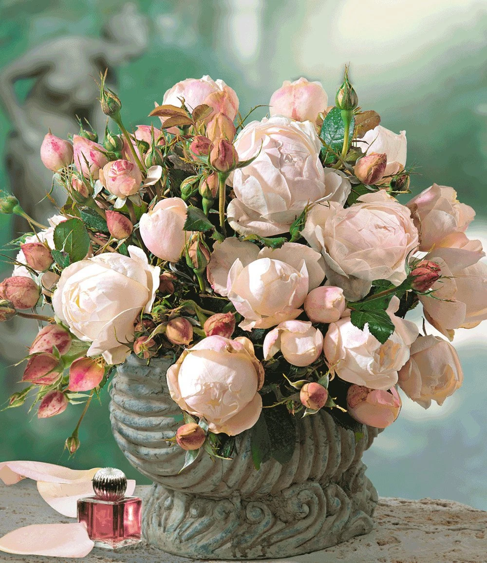 Die Rose der Liebe Madame Figaro® blüht im Sommer & bevorzugt einen sonnigen bis halbschattigen Standort. Die winterharten, mehrjährigen Strauchrosen werden 100 cm hoch. Der Pflanzabstand zu anderen Rosen & Pflanzen in Ihrem Garten sollte 40-60 cm betragen. Diese fast stachellose Rose bzw. Strauchrose strahlt mit ihren Blüten & wunderbarem Duft pure Romantik in Beet, Garten & Kübel aus. (Rosa ‚Madame Figaro®‘) (Rosa Hybride)