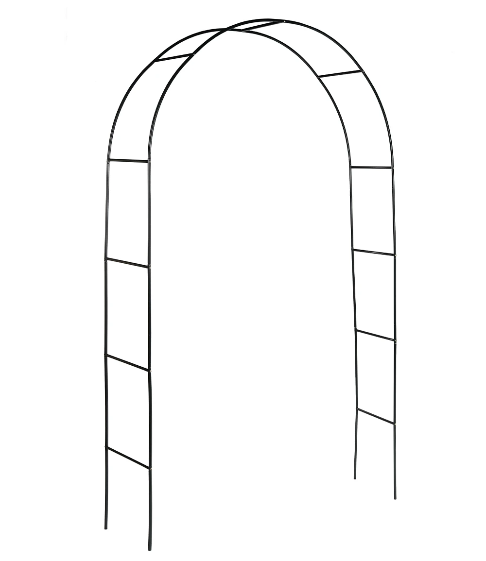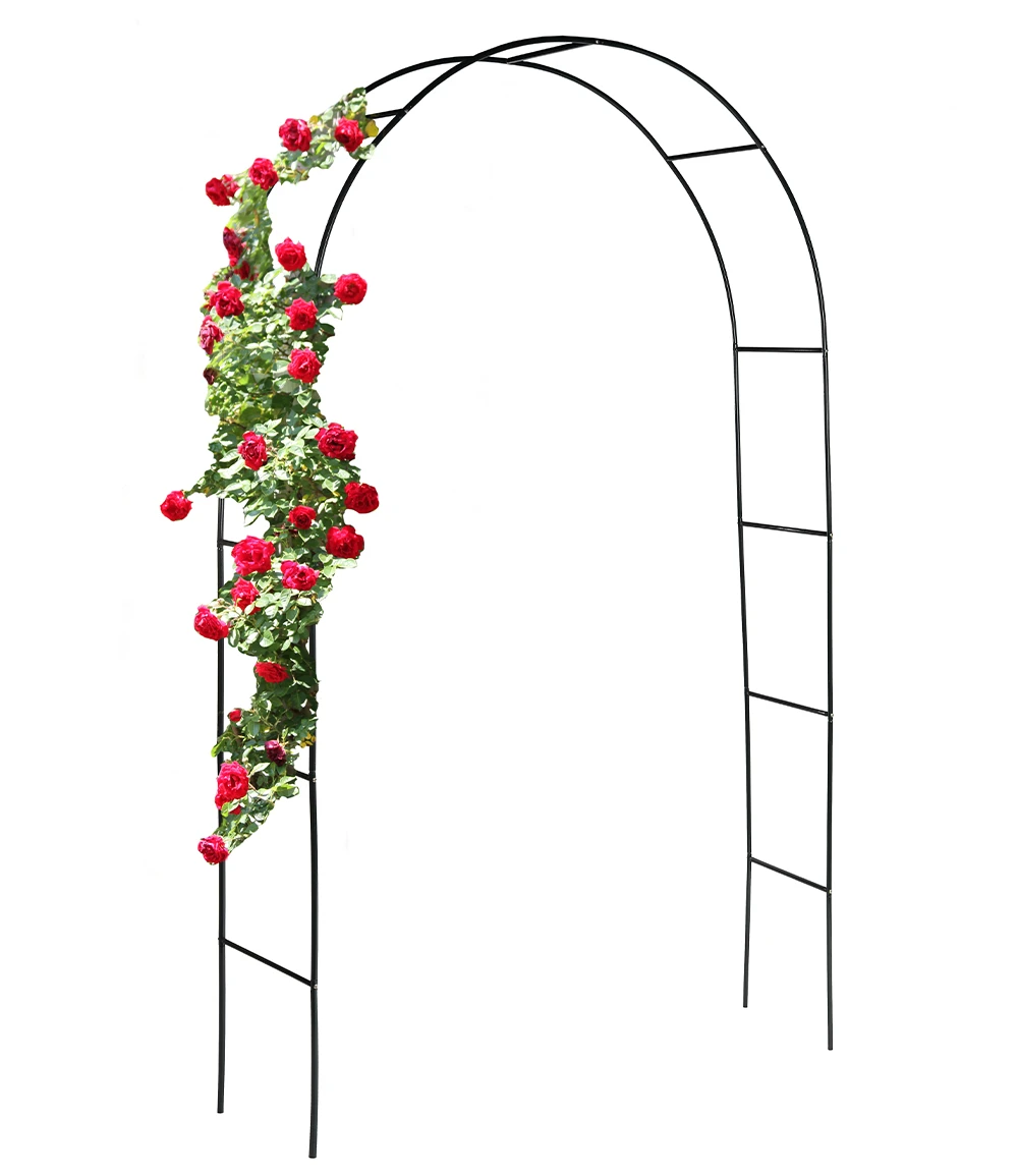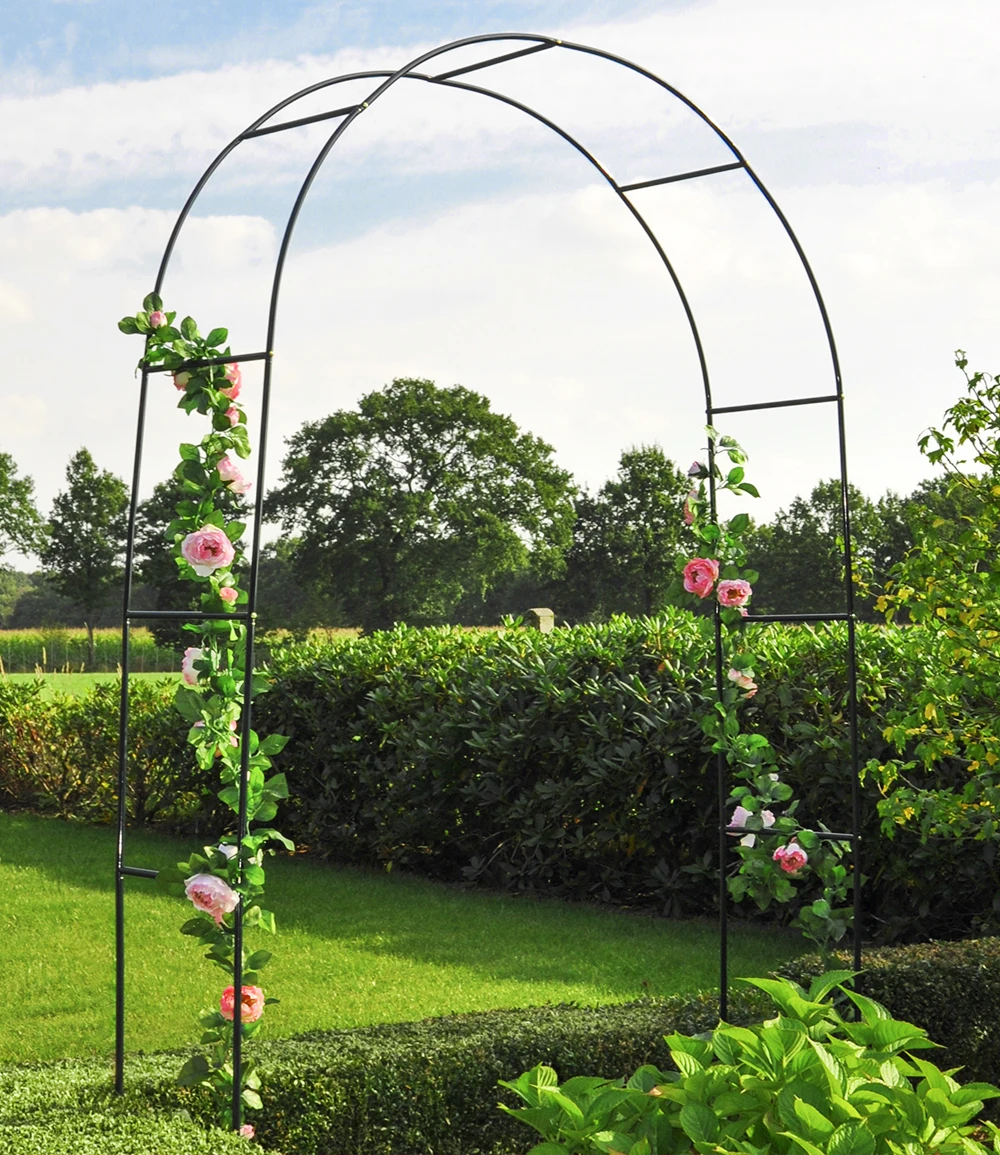 Dieser besonders günstige Rosenbogen beeindruckt vor allem durch seine leichte Montage. Der Rosenbogen schafft nicht nur für Kletterrosen und Kletterpflanzen, wie z.B. Clematis und Efeu geeignete Rankhilfen, auch Lilien oder andere hohe Stauden genießen die angebotene Hilfe. Rundrohr aus Stahl (Durchmesser 16 mm), schwarz lackiert mit grünen Spitzen.