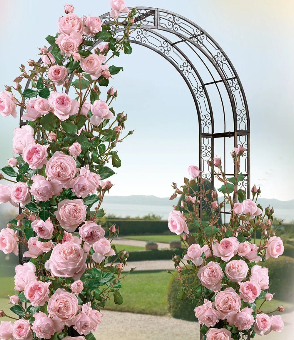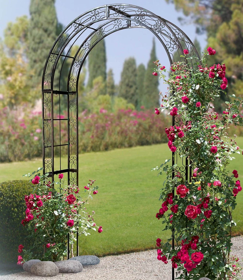 Der Rosenbogen Jamarie ist ein echtes Schmuckstück in hochwertiger Qualität. Der Rosenbogen aus Eisen zeichnet sich durch Standfestigkeit aus und ist leicht im Boden zu verankern. Der Rosenbogen Jamarie wird in Einzelteilen geliefert und mit den mitgelieferten Schrauben fixiert. Besonders auffallend ist die doppelte Anordnung der Bögen und die feinen filigranen Verzierungen. Die Verstrebungen bieten wertvolle Rankunterstützung.