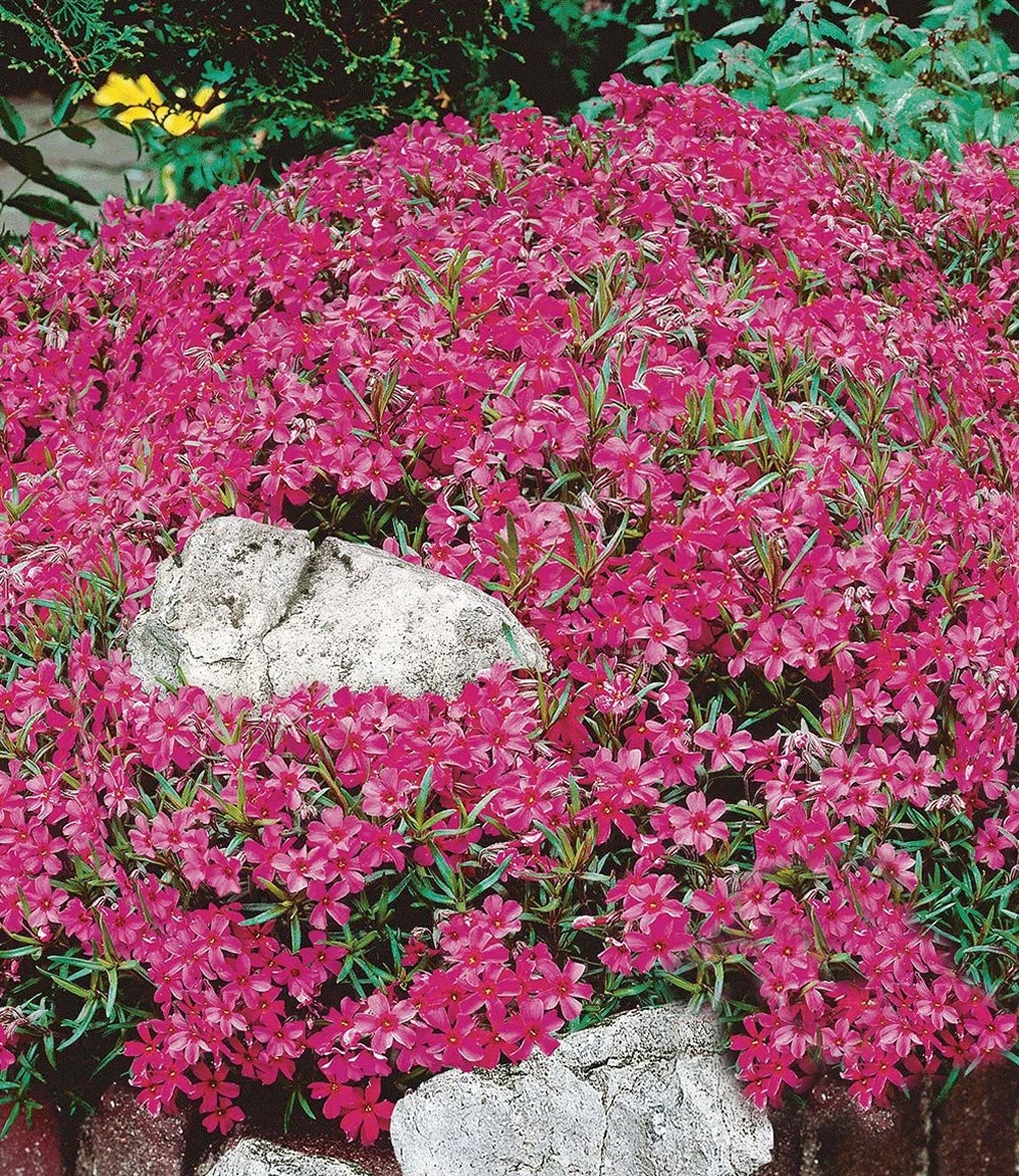 Unter Hobbygärtnern wird der Rote Teppich-Phlox auch Polster- oder Zwerg-Phlox genannt. Der beliebte Frühlingsblüher bildet dichte, blütenübersäte, immergrüne Polster, die sich besonders gut für Steingärten, Schalen und Mauern eignen. Die Blütenkaskaden hängen über Steine und Mauern und geben ein malerisches Bild ab. Der Rote Teppich-Phlox (Phlox subulata) verwandelt mit seiner Blütenfülle und Leuchtkraft Ihre Terrasse, Beetränder und Gartenbeete in ein wahres Blütenmeer. Solo oder in Kombination mit anderen frühjahrsblühenden Polsterstauden sind die charmanten, sternförmigen Blüten ein strahlender Blickfang!