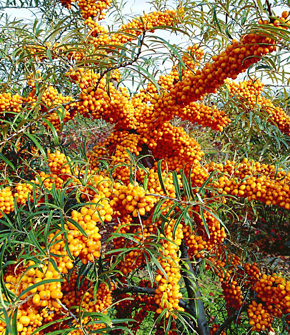 Wie an Perlenketten hängen die kugelrunden, korallen-farbenen Beeren an den Zweigen des Sanddorn Orange Energy®. Seit Jahrtausenden werden die Früchte des Nutz- und Zierstrauches als Leckerbissen geschätzt. Die Wenigsten wissen, dass kaum eine andere Frucht so viele Vitamine und Mineralien (Provitamin A, Vitamin B1, B2, E und K, sowie Kalzium, Kalium, Magnesium, Eisen, Zink und Beta Carotin) zu bieten hat. Selbst Zitrusfrüchte stellt der Sanddorn Orange Energy® (Hippophae rhamnoides Orange Energy®) in den Schatten, denn seine Beeren liefern das 5fache an Vitamin C (ca. 250 mg pro 100 g Früchte) als z.B. die Zitrone, man nennt ihn daher auch „Zitrone des Nordens“. Die Beeren können zu Saft, Marmelade & Gelee verarbeitet werden.