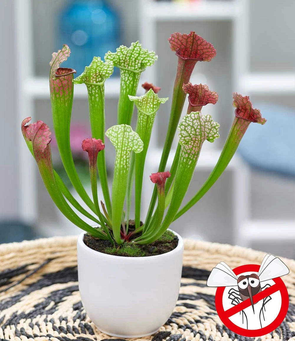 Eine fleischfressende Pflanze der Extraklasse für Haus oder Büro! Die winterharte Schlauchpflanze Jutathip Soper (Sarracenia), auch Trompetenpflanzen oder Trompetenblatt, stammt aus der Gattung fleischfressender Pflanzen. Bei dieser sehr seltenen Art werden die Blätter zu bizarren und leuchtend rosa Schläuchen umgewandelt. Am oberen Schlauchrand befindet sich eine glatte Oberfläche mit kleinen Rippen, die senkrecht nach unten verlaufen. Wenn die Insekten auf diese Fläche geraten, können sie nicht mehr entwischen und fallen in den Schlauch. Die Insekten werden durch die stacheligen Fühlborsten immer weiter in das Falleninnere gedrängt und letztendlich dort durch die Verdauungssäfte verdaut. So zieht sich die Schlauchpflanze Jutathip Soper alle wichtigsten Nährstoffe aus dem Insekt.