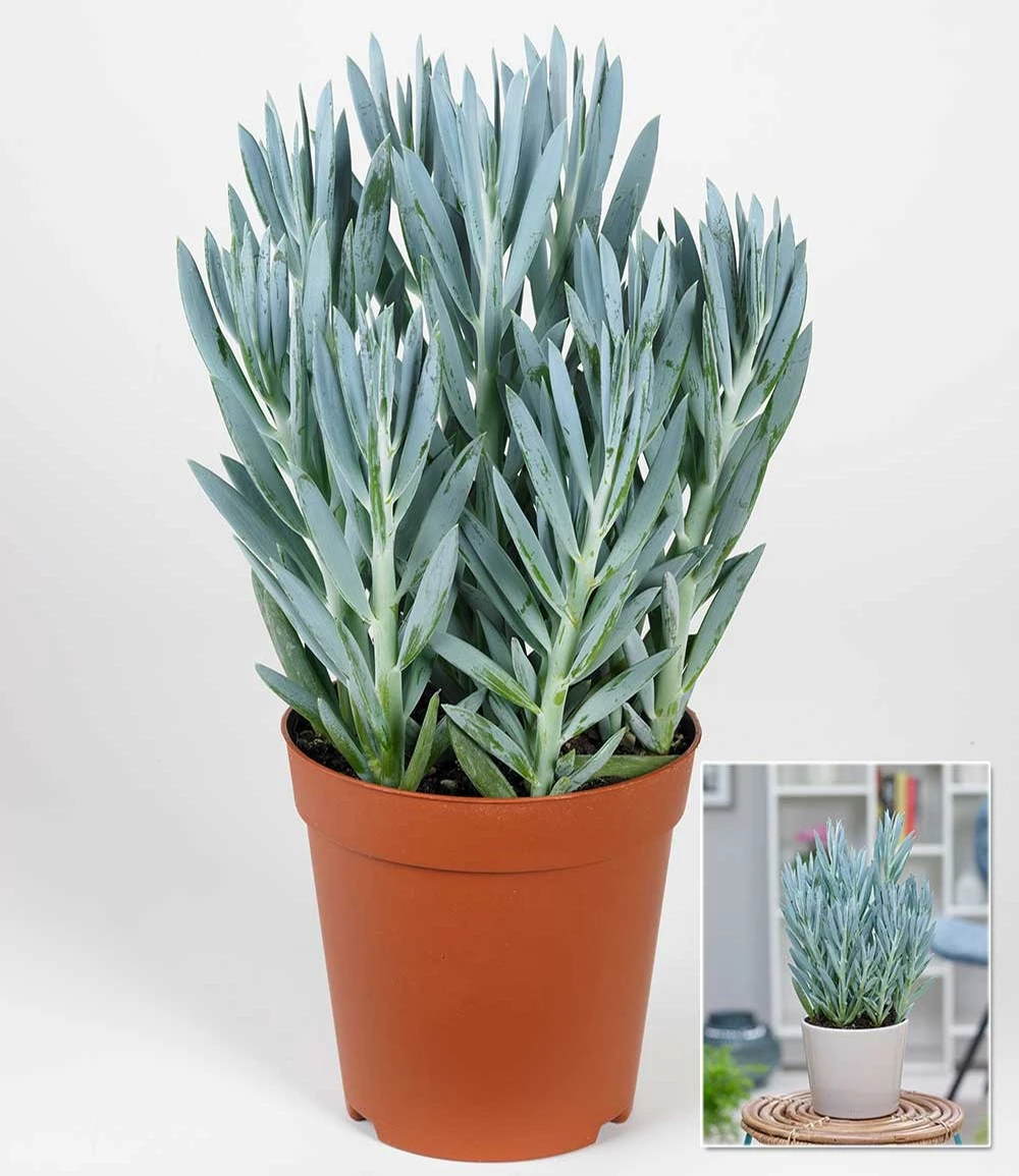 Die trendige Zimmerpflanze Senecio Aquarine® Mount Everest ist wirklich ein besonderer Blickfang für Ihr Zuhause oder das Büro! Die graublaue Wachsschicht auf den zylinderförmigen Blättern gibt ihr ein besonderes Erscheinungsbild. Die Senecio Aquarine® Mount Everest lässt sich sehr gut mit anderen Pflanzen kombinieren, hat aber genug Statur, um auch alleine die Show zu stehlen. Sowohl drinnen als auch auf Ihrer Terrasse wird sie prächtig gedeihen. Sie passt sehr gut in Töpfe, Vasen und Kästen in bunten Farben und aus verschiedenen Materialien.