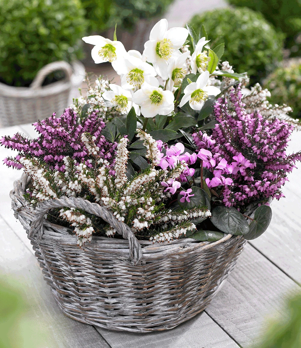 Lieferung: 3 Pflanzen Erika und 1 Pflanze Christrose, ohne Korb.