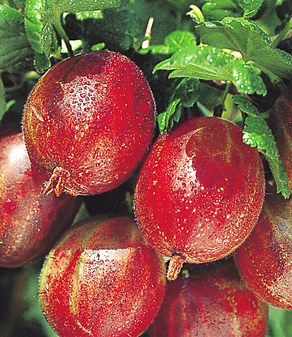 Endlich Stachelbeeren bequem ernten – ohne sich zu stechen! Wenn das Stachelbeer-Stämmchen Captivator ausnahmsweise Stacheln bildet, sind diese weich. Die Neuzüchtung gilt deshalb als ideale Sorte für den Hausgarten. Sie ist widerstandsfähig gegen Krankheiten & ertragreich. Die dunkelroten, leckeren Früchte des Stachelbeer-Stämmchen ‚Captivator‚ (Ribes uva crispa) sind besonders groß und aromatisch. Die Top-Sorte ist sehr robust, wuchsfreudig und ertragreich.