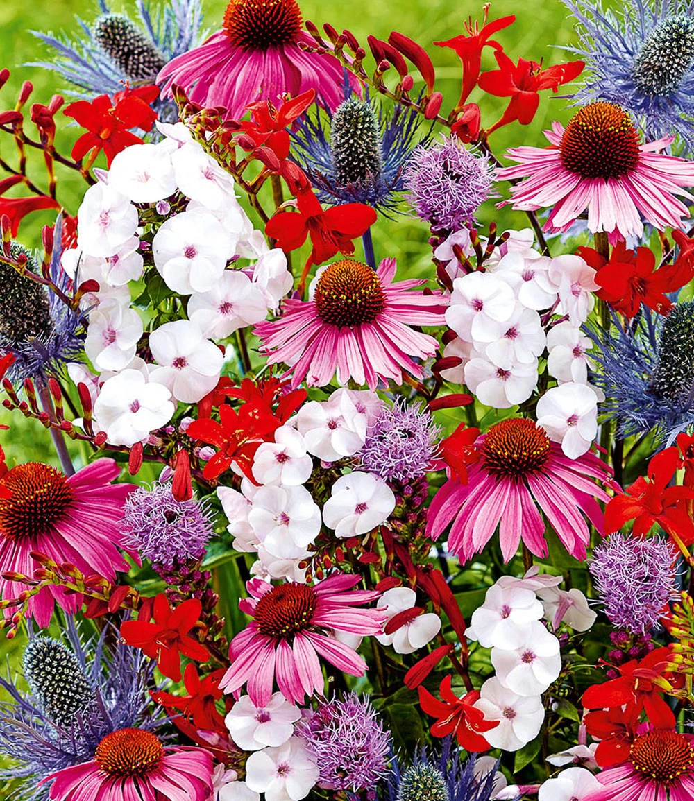 Die Blütezeit von Staudenbeet Blooms for Months ist von Juni bis Oktober, je nach Sorte. Die winterharten, mehrjährigen Stauden lieben einen sonnigen bis halbschattigen Standort im Beet & werden je nach Sorte 10 bis 80 cm hoch. Staudenbeete liefern Ihnen auch schöne Schnittblumen für die Vase. Ein Pflanzplan wird mitgeliefert. (Dianthus plumarius, Gaillardia, Fuchsia Hybride, Rosmarinus officinalis, Oenothera, Nepeta, Lavandula angustifolia, Delosperma congesta, Rubeckia fulgida, Echinacea purpurea)