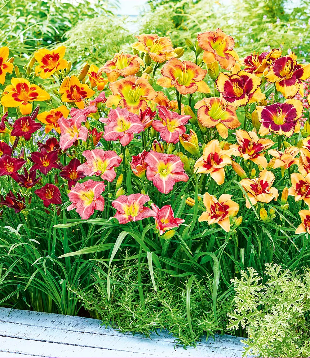 Der 6er Taglilien-Mix Sommertraum produziert in Ihrem Garten eine Fülle von bunten, lilienartigen Blüten. Die imposanten Trompeten sind bis zu 18 cm groß und sorgen für einen auffälligen Blickfang in Beeten und Rabatten. Zuverlässig und robust sind diese Stauden auch eine großartige Ergänzung für Kübel auf Balkon & Terrasse oder sogar als Schnittblume für die Vase. Der aufregende Taglilien-Mix Sommertraum (Hemerocallis) wächst und gedeiht ohne viel Pflege und liebt einen gut durchlässigen Boden. Die unglaubliche Mischung bereichert jeden Sommergarten mit ihrer Farbenpracht und Blütenfülle. Sie erhalten 6 kräftige Knollen in den 6 abgebildeten Farben.