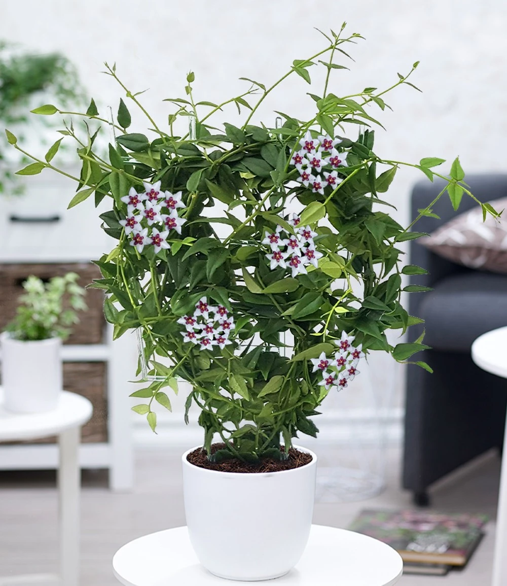 Die Wachsblume Hoya bella ist eine Zimmerpflanze, die von März bis August an ihren langen Ranken wunderschöne Blütendolden ausbildet. Die eleganten, weißen Blüten mit rosa-pinkfarbener Mitte erinnern an zartes Porzellan und verströmen in den Abendstunden einen intensiven, süßen Duft. Die Wachsblume Hoya bella ist auch unter dem Namen Porzellanblume bekannt und dekoriert mit ihrem hängenden Wuchs Blumenampeln oder ein Spalier. Die langen Triebe der Zimmerpflanzen, an denen leuchtend grüne, schmale Blätter sitzen, zieren Büro- und Wohnräume & den Wintergarten sowie im Sommer auch Balkon & Terrasse. Dann werden die Pflanzen mit den Dolden aus sternförmigen Blüten zum exotischen Blickfang.