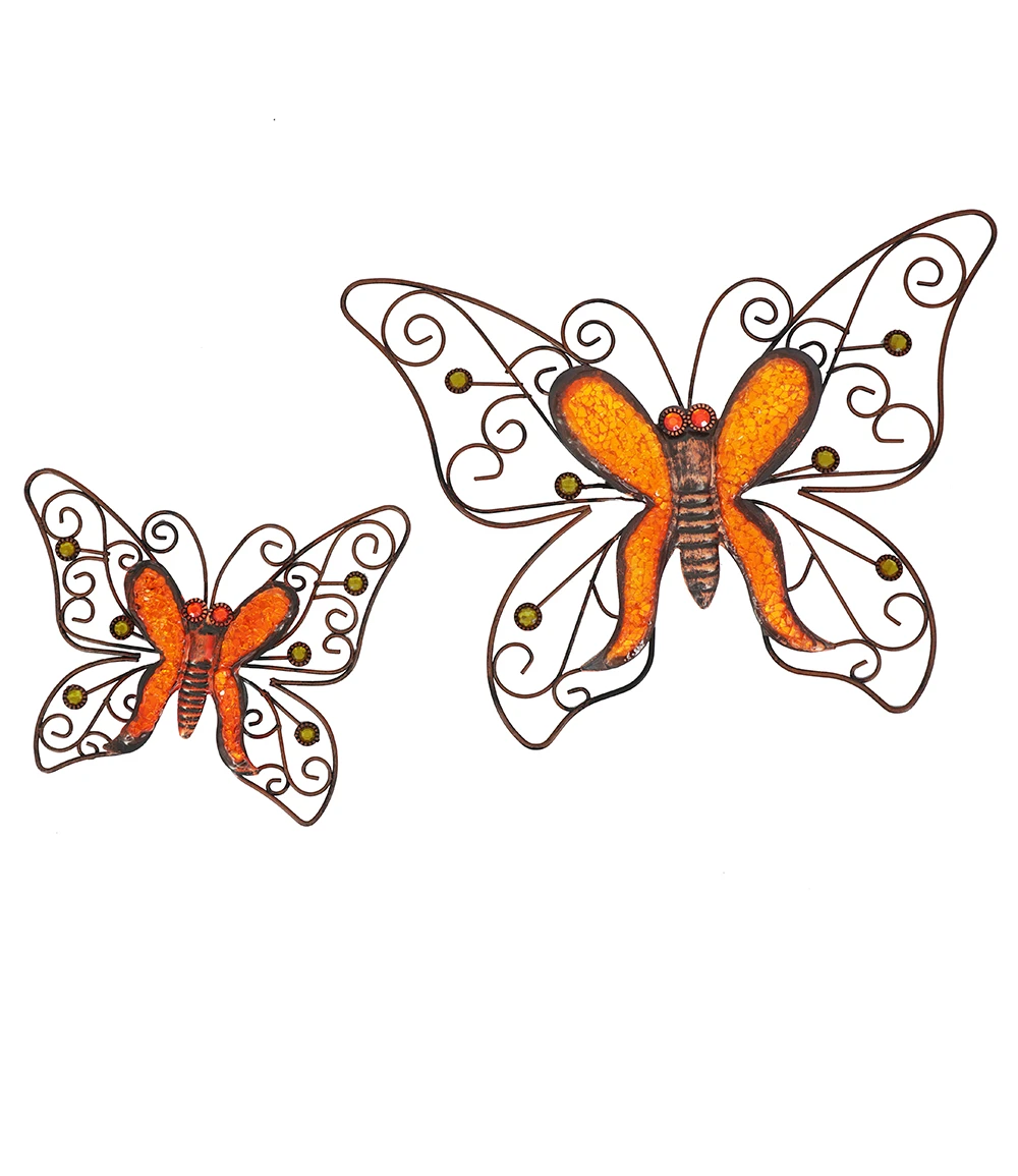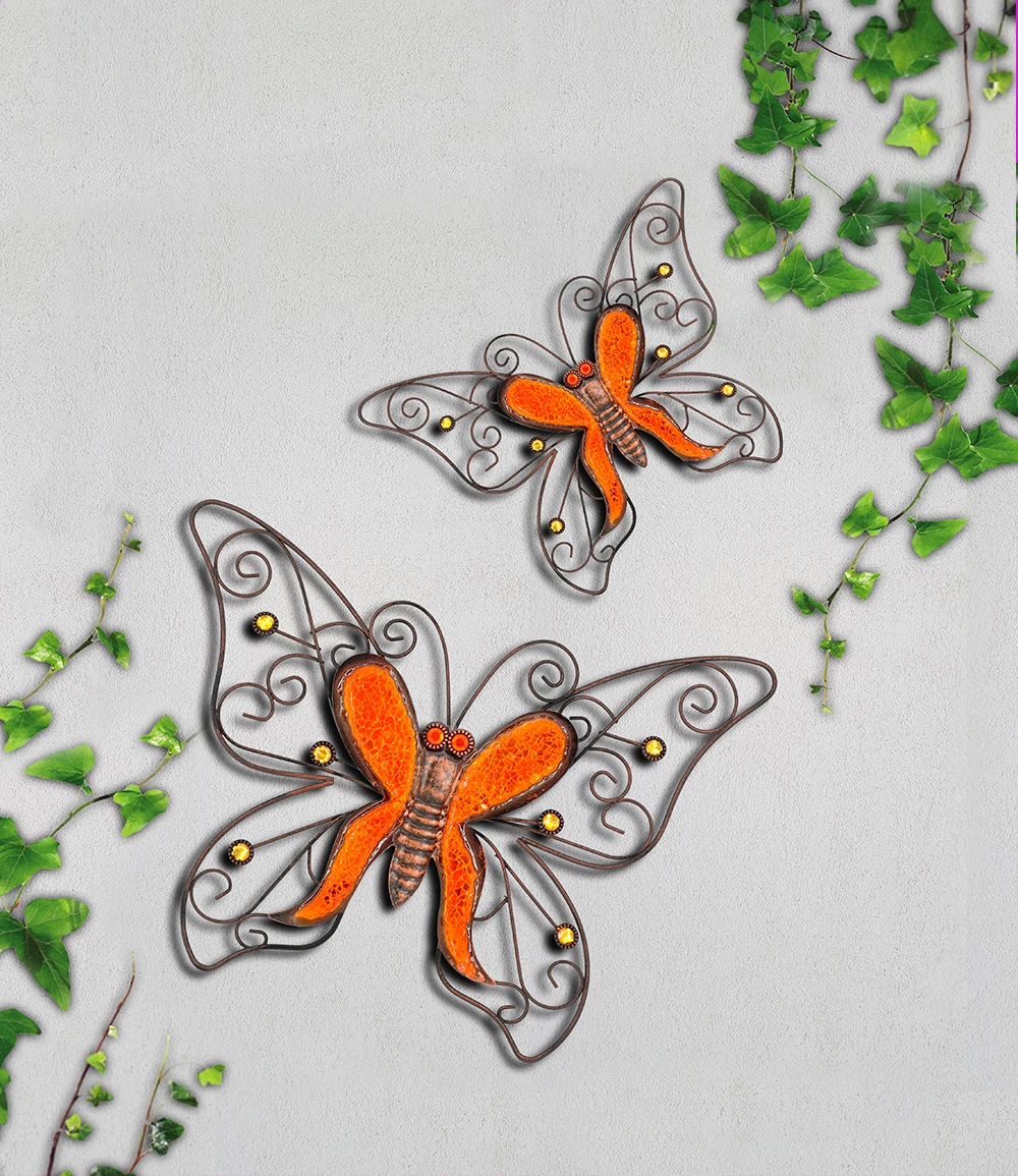 Jedes Stück der Wanddekoration Schmetterling ist ein Unikat, das mit unvergleichlicher Wirkung Ihre Wohnung, Terrasse & Ihren Balkon ziert. Die zwei unterschiedlich großen Schmetterlinge aus Metall und Glas werden mit ihren detailreichen Flügeln zum Blickfang und sind auch eine wunderschöne Geschenkidee. Die kunstvollen Skulpturen lassen sich ganz einfach als Wanddeko befestigen.