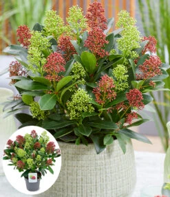 Die Skimmia ‚Double Diamond®‘ trägt ab Herbst wochenlang sowohl rote als auch gelbgrüne Blütenknospen, die sich im Frühling zu cremeweißen, duftenden Blütendolden öffnen! Ein wunderschöner, immergrüner Strauch, der im Kübel auf Balkon und Terrasse das ganze Jahr über eine gute Figur macht, aber auch in gemischten Rabatten im Garten zum Hingucker wird. Die Skimmia ‚Double Diamond®‘ (Skimmia japonica) ist sehr pflegeleicht und auch für schattige Plätze perfekt geeignet. Wir liefern kräftige Pflanzen, wie abgebildet, die Sie direkt für Ihre herbstlichen Dekorationen einsetzen können (Lieferung ohne Deko-Topf).
