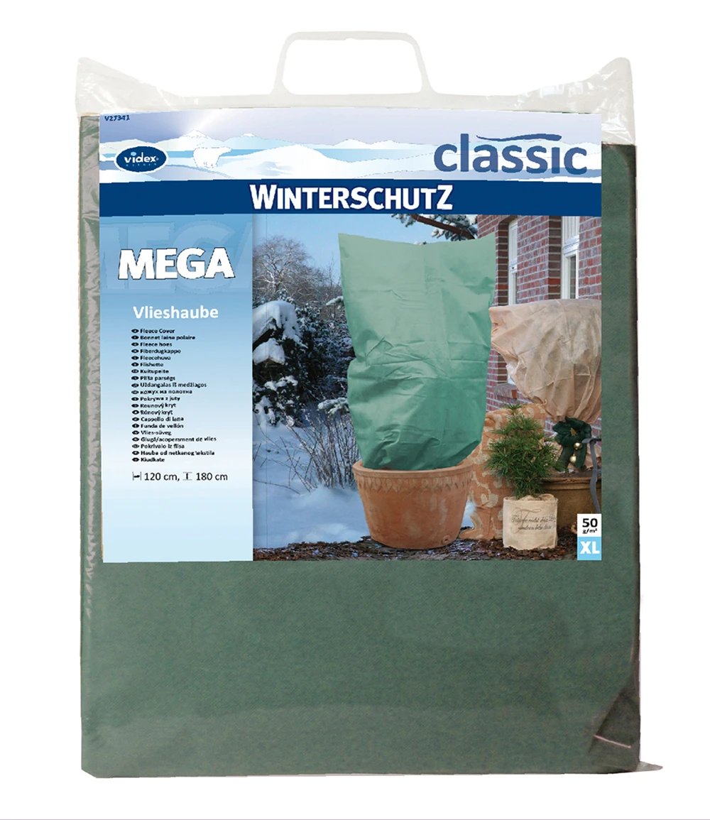 Die Winterschutz Mega Vlieshaube XL dunkelgrün bietet für größere, empfindliche Pflanzenkronen, z.B. von mediterranen Pflanzen, den geeigneten Schutz vor Frost und Schnee. Palmen, Olivenbäume und Oleander erfreuen sich immer größerer Beliebtheit und halten Einzug in unsere Gärten und auf Balkon & Terrasse. Für diese Pflanzen empfiehlt sich ein geeigneter Schutz gegen Schnee und Kälte, da der Frost sie leicht beschädigen, oder bei Dauerfrost sogar zerstören kann. Mit der Winterschutz Mega Vlieshaube XL dunkelgrün bleiben die Pflanzen auch im Winter ein dekorativer Blickfang und sind gut geschützt. Der seitliche Reißverschluss und die Zugkordel unten zum Fixieren der Mega-Vlieshauben ermöglichen eine gute Handhabung, sodass die Pflanze nicht beschädigt wird. Die Vlieshauben sind UV-und witterungsbeständig und durchlässig für Luft, Licht und Feuchte. Mit der Winterschutz Mega Vlieshaube XL dunkelgrün bringen Sie Palme, Bambus, Olivenbaum & andere Kübelpflanzen sicher durch den Winter und sorgen auch im nächsten Jahr wieder für ein mediterranes Flair in Ihrem Garten! Die Winterschutz-Vlieshaube ist in verschiedenen Farben, unifarben und bedruckt, sowie in unterschiedlichen Größen erhältlich.