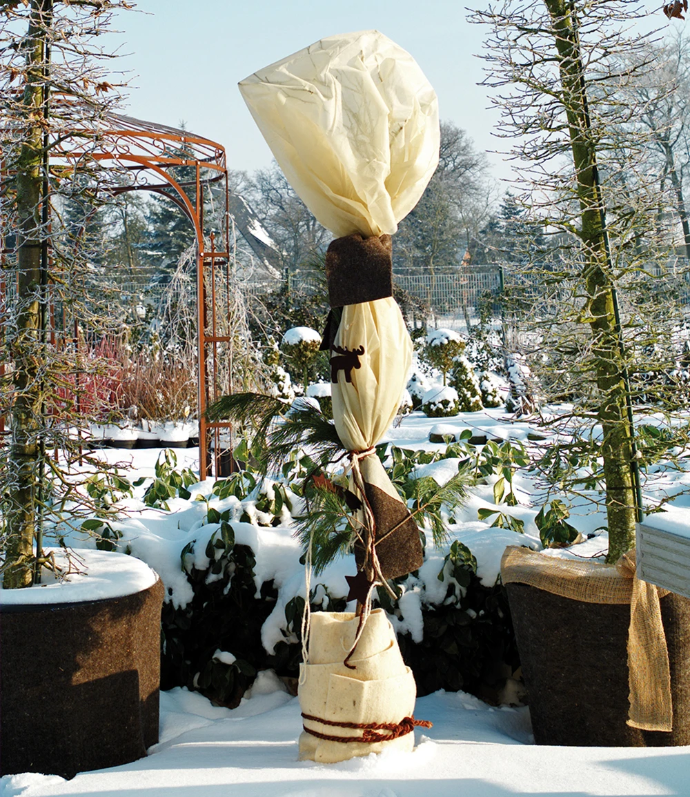 Mit dem Winterschutz Schlauch 0,8×5 m haben die Kronen von Topf- und Kübelpflanzen, von empfindlichen Gehölzen und Rosen einen Schutz vor Frost, eisigem Wind oder intensiver Wintersonne. Schneiden Sie den praktischen Wintervlies-Schlauch auf die gewünschte Länge zu und stülpen Sie ihn über die Pflanze. Den Winterschutz Schlauch mit farbigen Kordeln und Bändern aus Jute oder Bast befestigen und schon haben Sie einen dekorativen und sicheren Frostschutz. Das leichte Material kann auch für immergrüne Pflanzen verwendet werden, denn es ist ausreichend durchlässig für Licht, Feuchtigkeit und Luft. Durch den Winterschutz Schlauch 0,8×5 m wird die Verdunstung von Wasser über die Blätter der immergrünen Pflanzen vermindert und Spannungsrisse in er Rinde vermieden. Rosen, Buchs & Co. sind besonders im Kübel dankbar für dieses Frostschutzvlies.