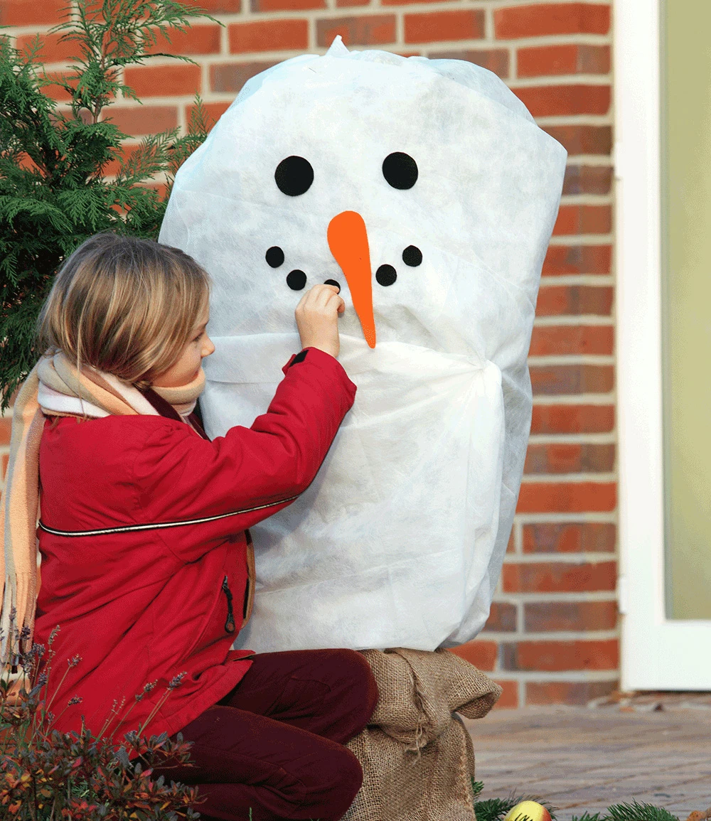 Der dekorative Winterschutz ‚Schneemann‚ isoliert die Kronen von kälteempfindlichen Topf- und Kübelpflanzen, empfindlichen Gehölzen und Rosen gegen Minustemperaturen. Die UV- und witterungsbeständige Vlieshaube schützt Ihre Pflanzen dekorativ und wirksam vor Kälte, Schnee, Wind & Regen. Ein perfekter Winterschutz, der Laune macht! Supereinfach anzubringen: Vlies über die Pflanze stülpen und Zugband ziehen – fertig! Das integrierte Zugband ermöglicht eine gute Handhabung der Haube, sodass die Pflanze nicht beschädigt wird. Das Vlies schützt Pflanzen zuverlässig vor Frost, Austrocknen und eisigem Wind. Der Winterschutz ‚Schneemann‘ ist durchlässig für Feuchte, Licht und Luft. Ein dekorativer Frostschutz für den Außenbereich. Ihre Pflanzen werden es Ihnen danken. Material: 100% Vlies 50g/qm