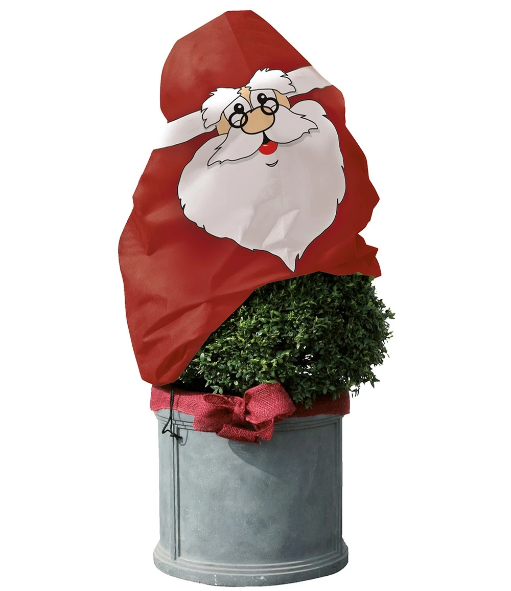 Die originelle Winterschutz Vlieshaube SANTA schützt im Winter Ihre Pflanzen vor Frost & Schnee und ist eine fröhliche Dekoration im Garten, auf Balkon & Terrasse oder vor dem Hauseingang. In der Advents- und Weihnachtszeit ist das Wintervlies mit aufgedrucktem Weihnachtsmann-Motiv ein schöner Blickfang. Die Winterschutz Vlieshaube SANTA wird einfach über die Krone von Rosen, über kleine Gehölze, Topf- und Kübelpflanzen im Außenbereich gestülpt und mit der Kordel unten fixiert.