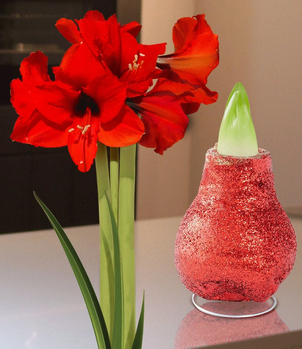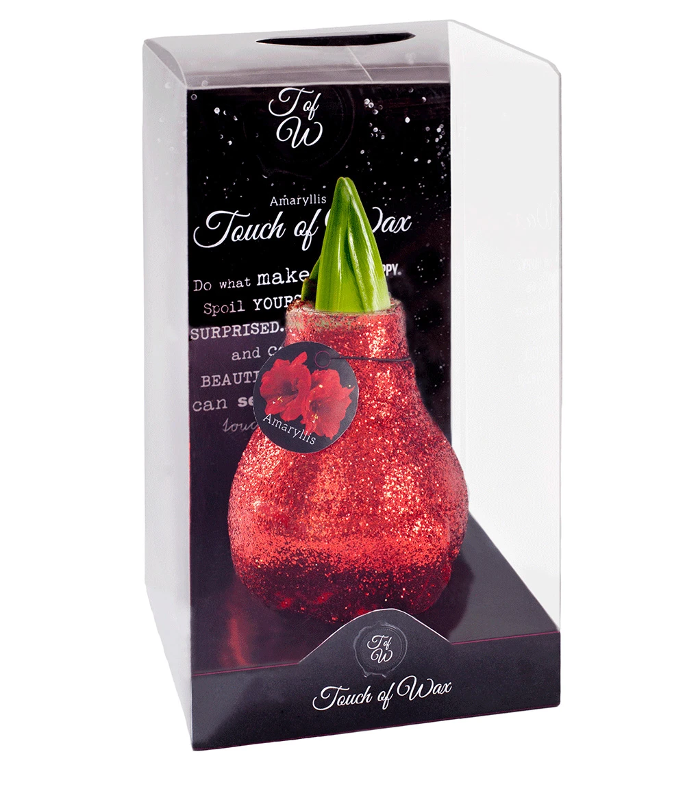 Die extra-große Zwiebel (Umfang 30-32 cm) steht auf einem Edelstahl-Fuß und braucht keine Erde und kein Wasser um zu wachsen und zu blühen. Die Wachs-Amaryllis Touch of Magic Rot ist ein eleganter und außergewöhnlicher Blickfang, denn die Amaryllis-Zwiebel ist umhüllt von glitzerndem, roten Wachs. Die Wachs-Amaryllis Touch of Magic Rot kann im Haus innerhalb von 4 bis 6 Wochen zum Blühen gebracht werden. Dann entfaltet sich ein beeindruckendes Blütenspektakel mit großen, leuchtend roten Prachtblüten und erfreut Sie viele Tage lang. Die Zwiebel wird in einem luxuriösen Geschenkkarton geliefert.