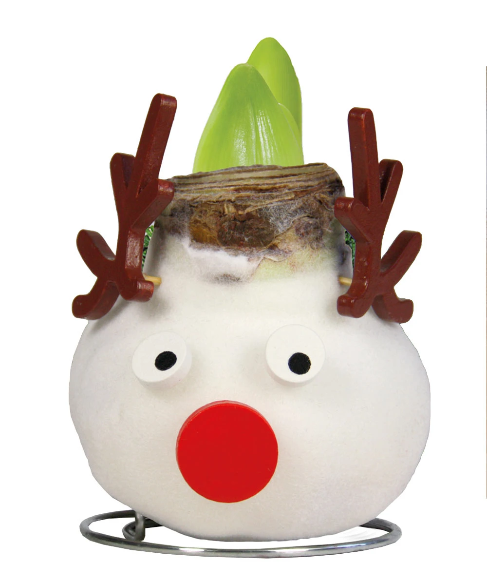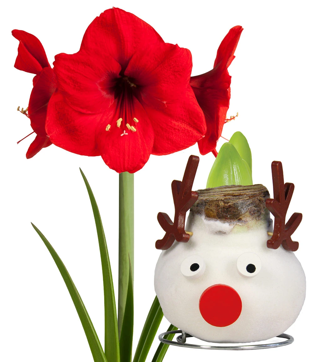 Die extra-große Zwiebel (Umfang 30-32 cm) steht auf einem Edelstahl-Fuß und braucht keine Erde und kein Wasser um zu wachsen und zu blühen. Die Wachs-Amaryllis ‚X-mas‘ Rentier ist ein origineller und außergewöhnlicher Blickfang, denn die Amaryllis-Zwiebel ist umhüllt von Wachs und wie ein niedliches Rentier geschmückt. Die Wachs-Amaryllis ‚X-mas‘ Rentier kann im Haus innerhalb von 4 bis 6 Wochen zum Blühen gebracht werden. Dann entfaltet sich ein beeindruckendes Blütenspektakel mit großen, leuchtend roten Prachtblüten und erfreut Sie viele Tage lang. Die Zwiebel wird in einem luxuriösen Geschenkkarton geliefert.