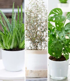Ein Blickfang im Zimmer: Diese Zimmerpflanzen-Kollektion enthält 1 Pflanze Aloe Vera, 1 Maori® Sophora Cotoneaster ‚Little Baby‘ und 1 Pflanze Monstera ‚Monkey Leaf‘.